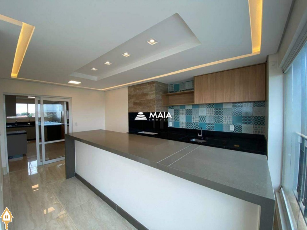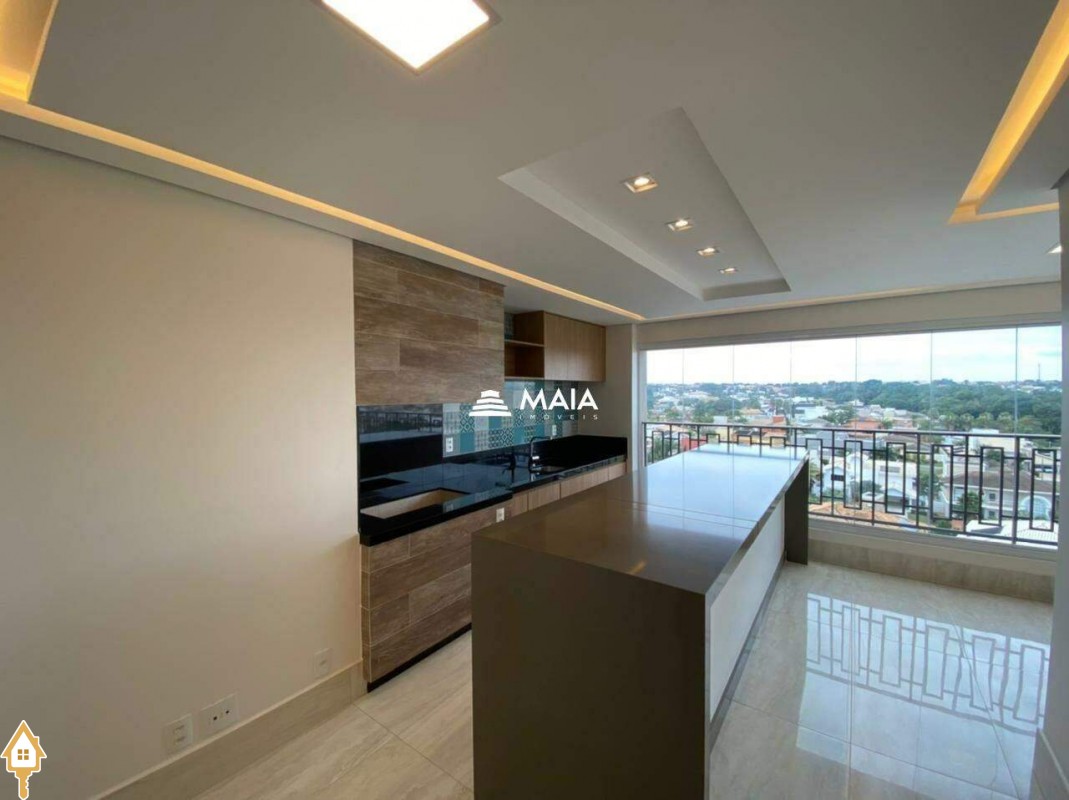 - Varanda gourmet com bancada com acabamento modificado e armários na bancada da pia e superior;