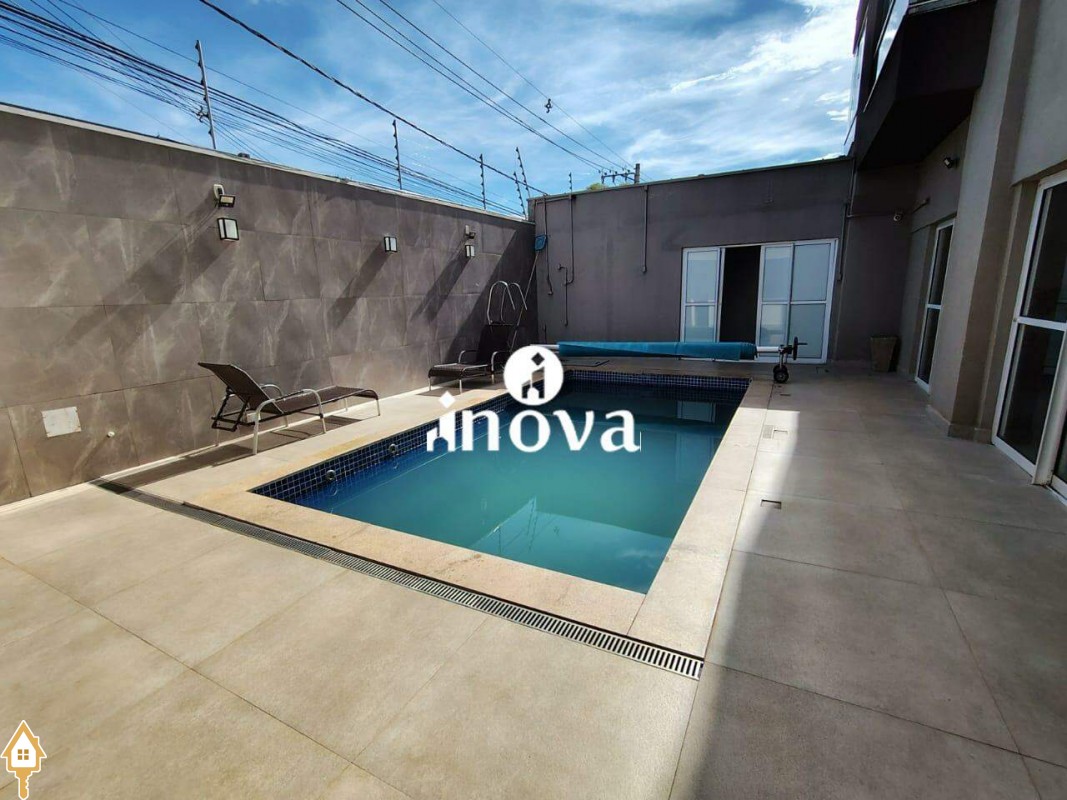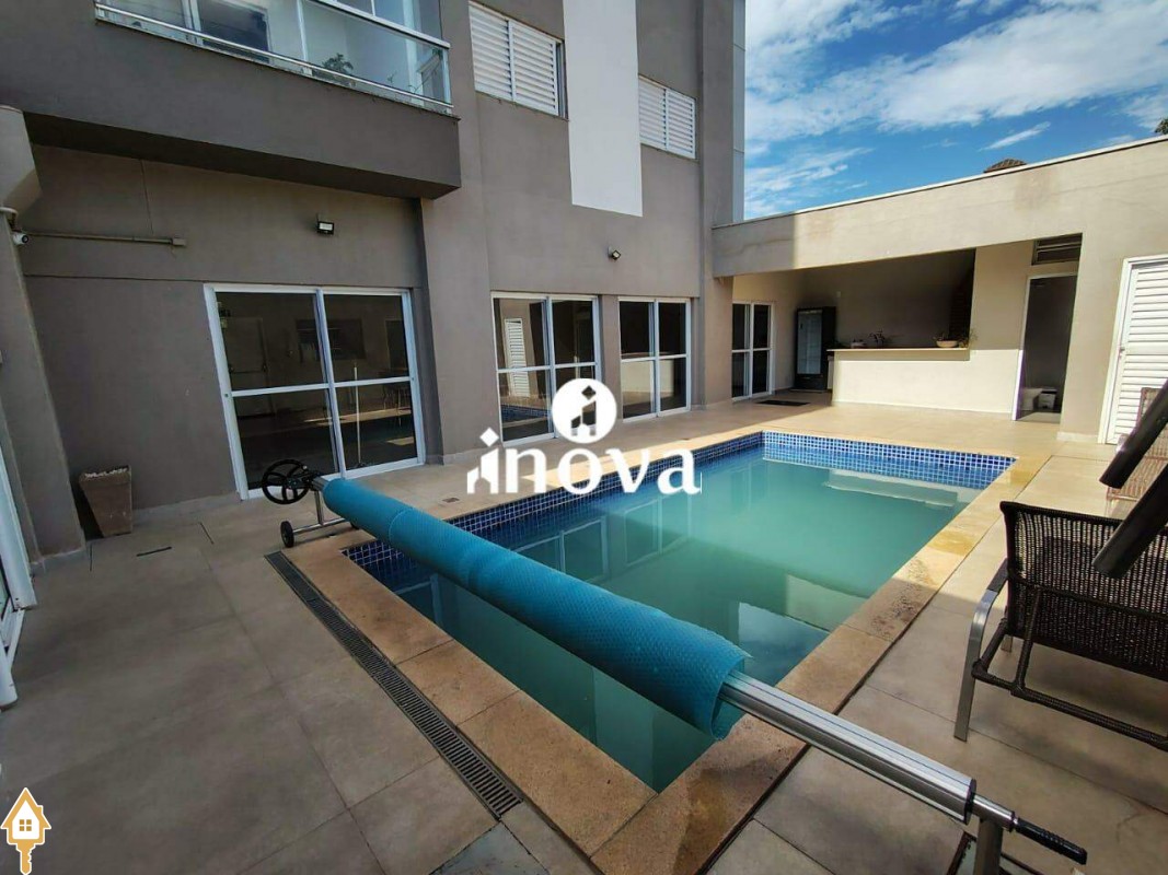 Prédio com elevador, salão de festas e área de lazer com piscina e churrasqueira.