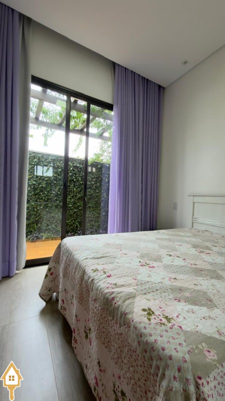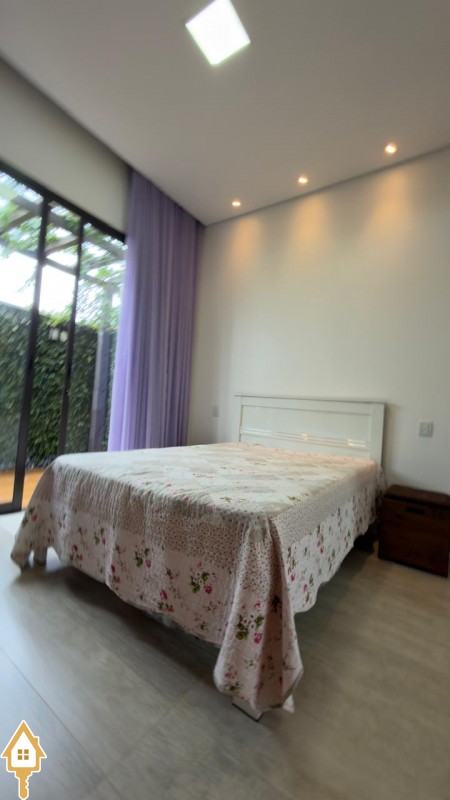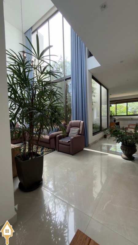 No piso inferior: 1 suíte, lavabo, sala com pé-direito alto, painel de vidro e vista para o jardim, cozinha e lavanderia.
