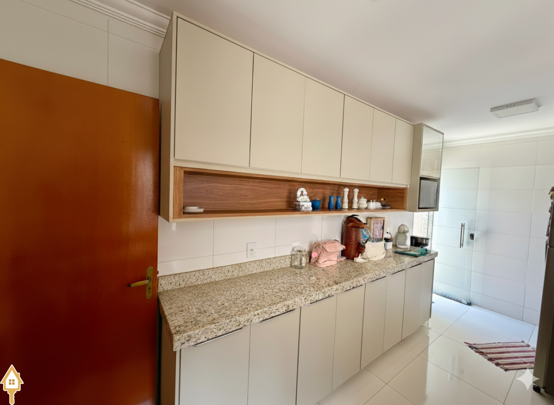 Cozinha ampliada, completa com armários, fogão cooktop, lavanderia com estendal coberto e quarto de despejo ou dispensa, separados.