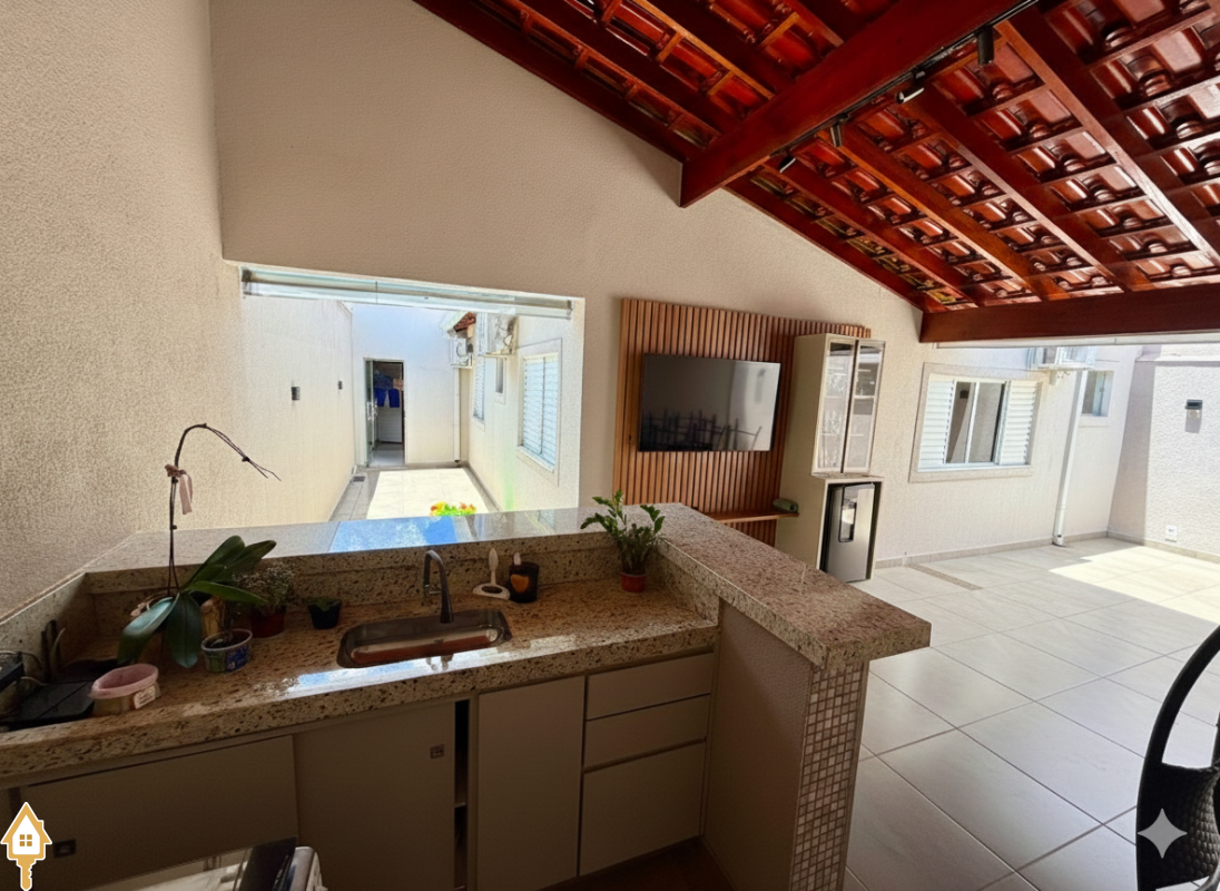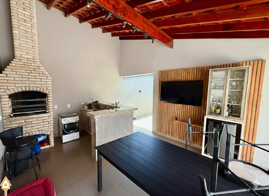 Varanda gourmet caprichada, com churrasqueira e bancada gourmet, wc externo e ainda contando com ótimo espaço livre.