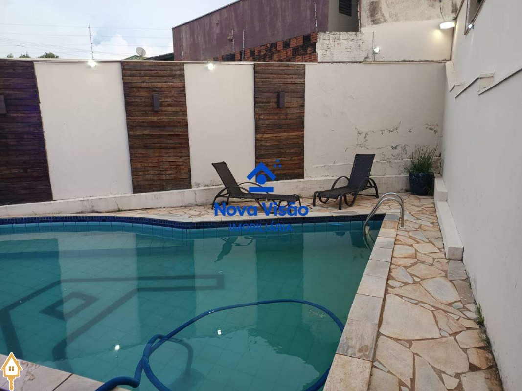 Piscina com 48 mil litros planejada com pequena ilha lateral com profundidade para crianças a partir de 6 anos