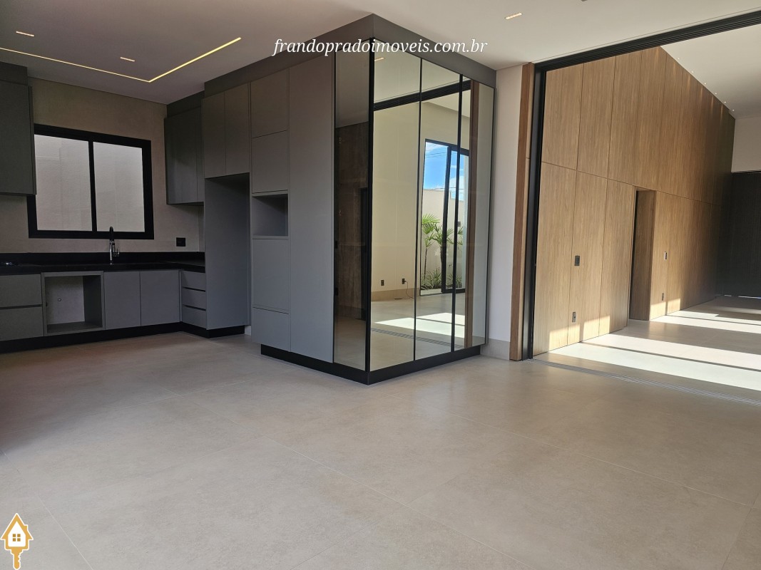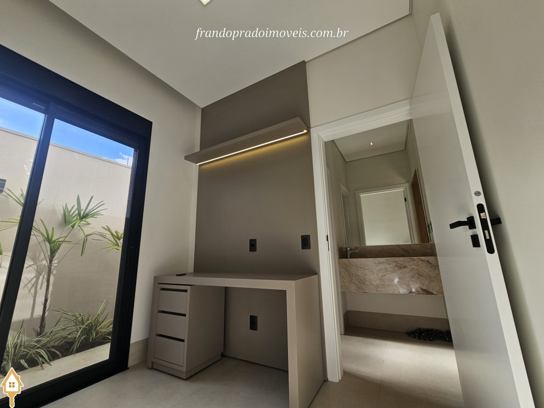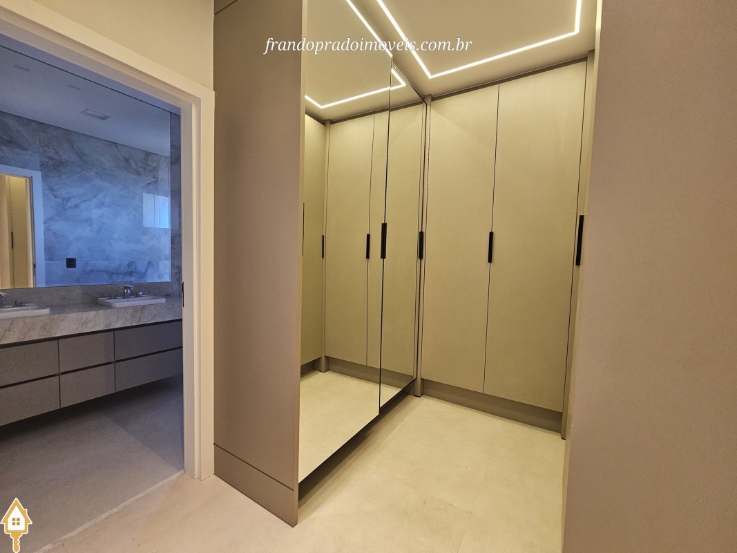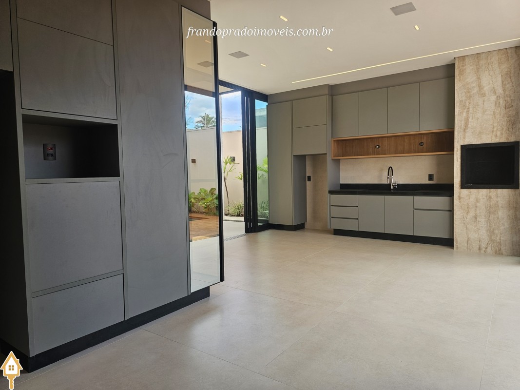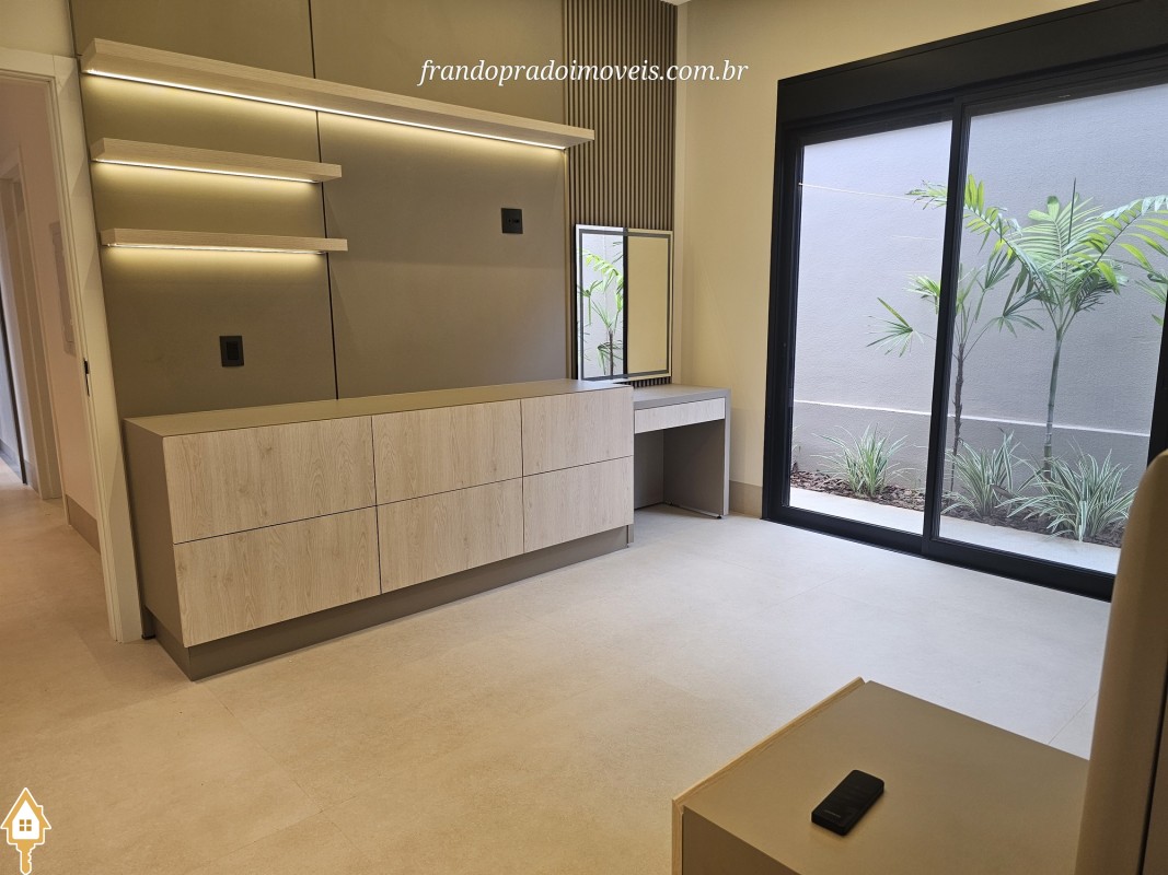A área social integra sala com pé-direito alto, cozinha planejada e espaço gourmet amplo e funcional. São 3 suítes, sendo a principal com closet, além de escritório com esquadria automatizada e lavabo.