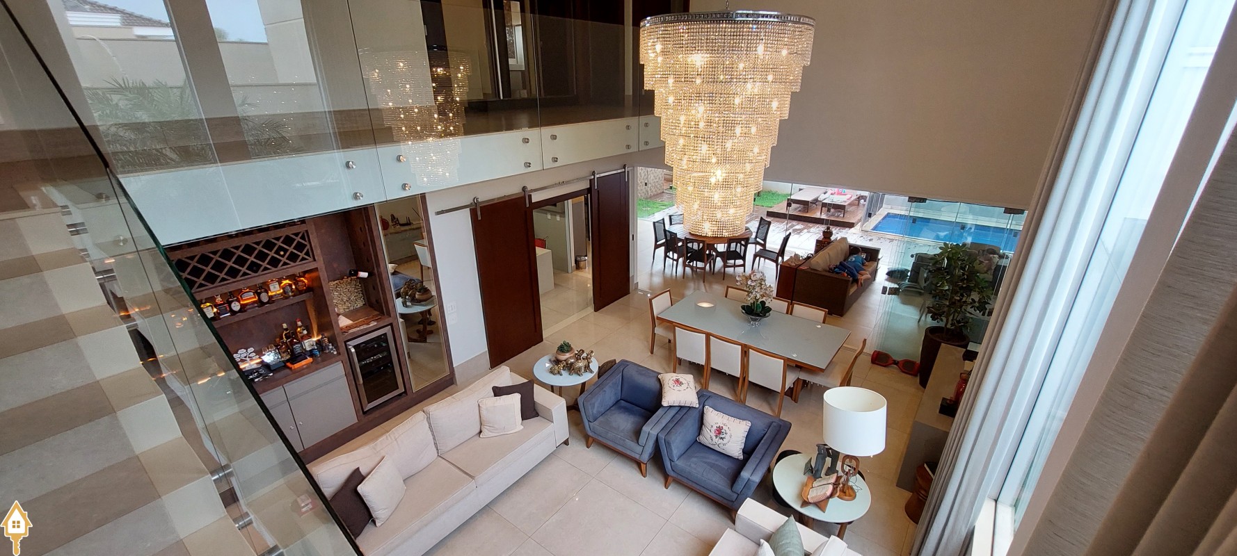.Sala com pé direito duplo, sala de estar e jantar com lustre sob medida,