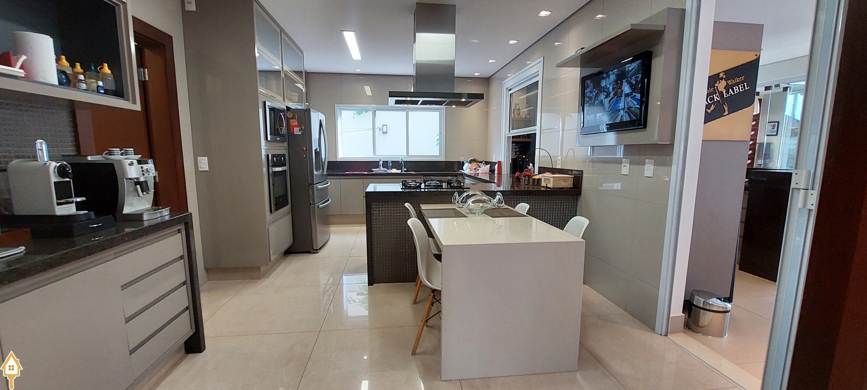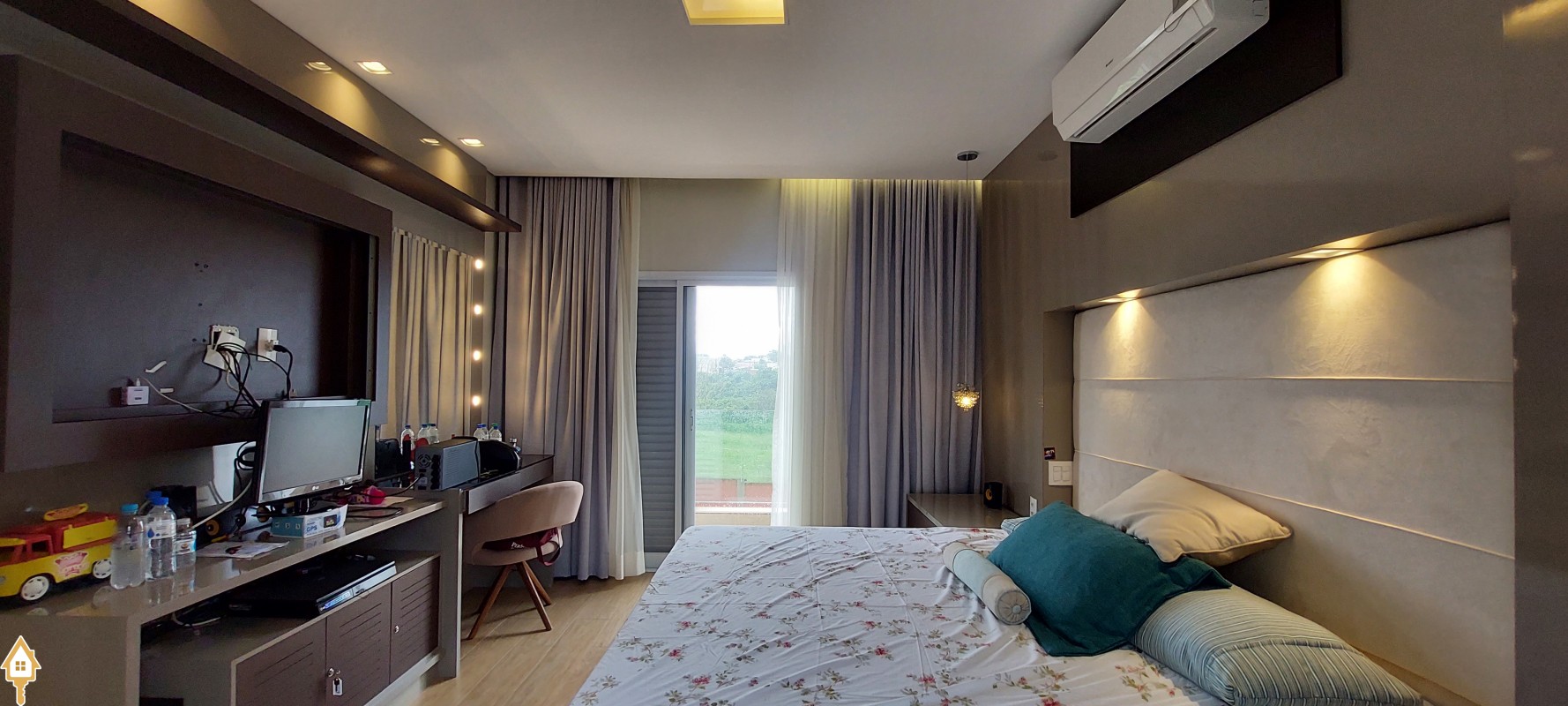 A casa apresenta sistema de automatização: iluminação, toldo, cortinas, áudio e vídeo, ar condicionado e irrigação de jardins.
