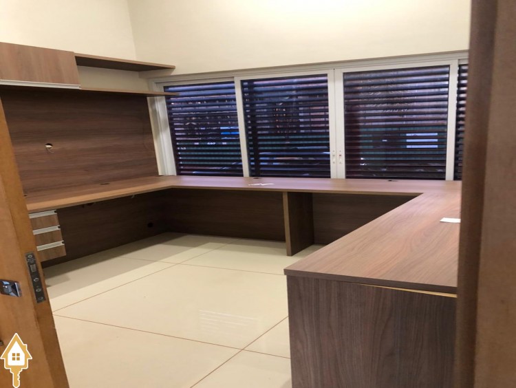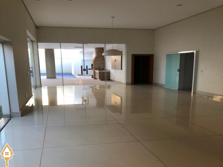 Sala principal para dois ambientes com pé direito duplo. A casa possui 3 suítes, escritório, lavabo, varanda integrada com churrasqueira, piscina aquecida, cozinha com despensa e lavanderia.