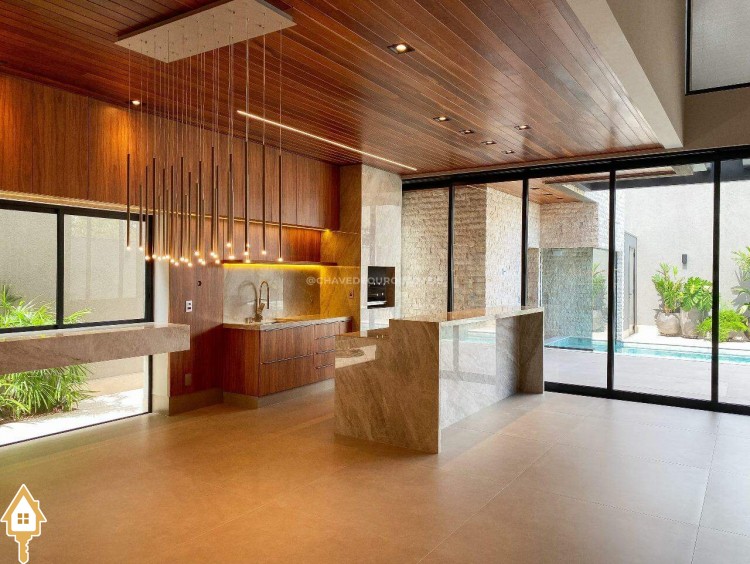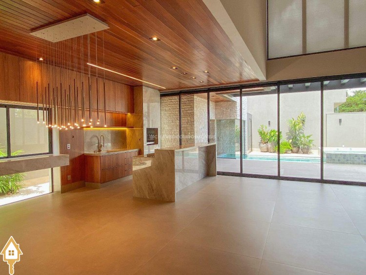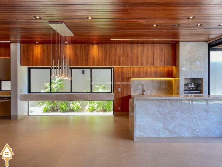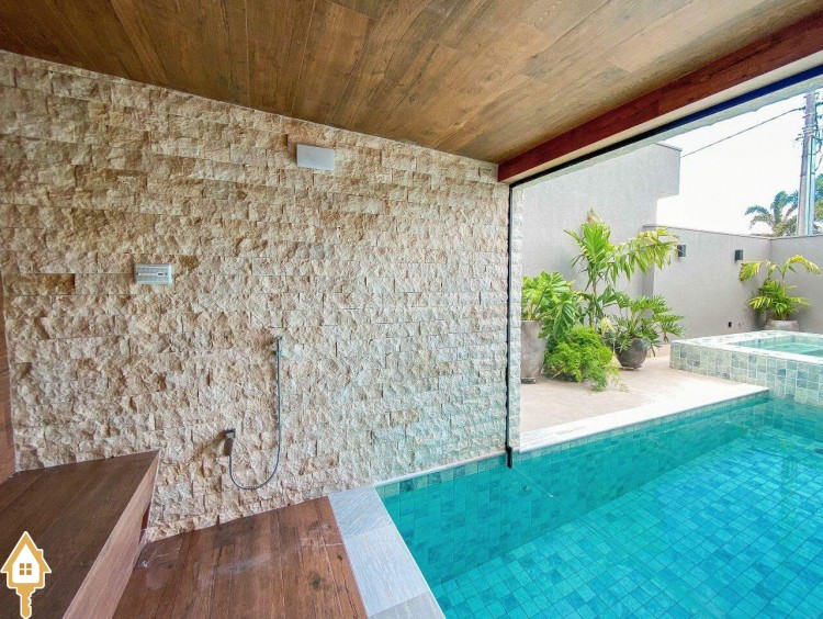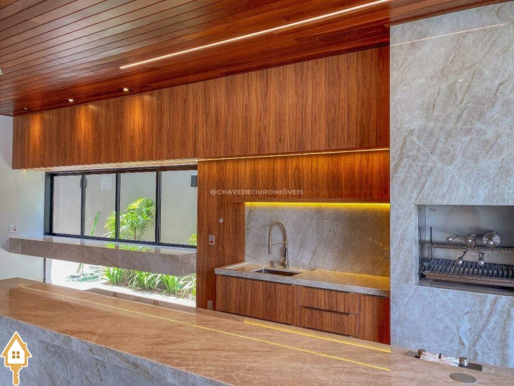 A cozinha gourmet, adornada com pedras Taj Mahal e equipada com eletrodomésticos de primeira linha da Eletromec, é perfeita para momentos de confraternização. Para o bem-estar, a casa oferece uma sauna molhada a vapor e uma piscina integrada com sauna e ofurô, com capacidade para até 12 pessoas, todos com aquecimento e iluminação automatizados.