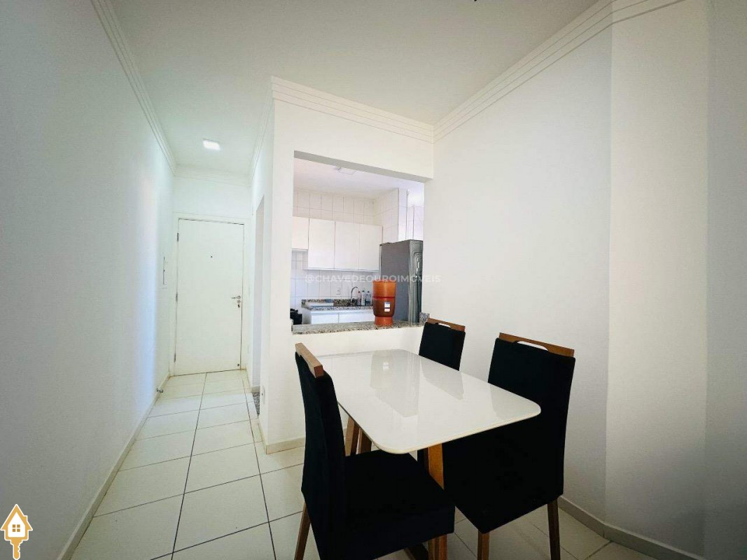 A cozinha planejada com armários garante funcionalidade no dia a dia, enquanto a área de serviço complementa a praticidade do ambiente. Além disso, o apartamento conta com interfone, portão eletrônico e uma vaga de garagem.