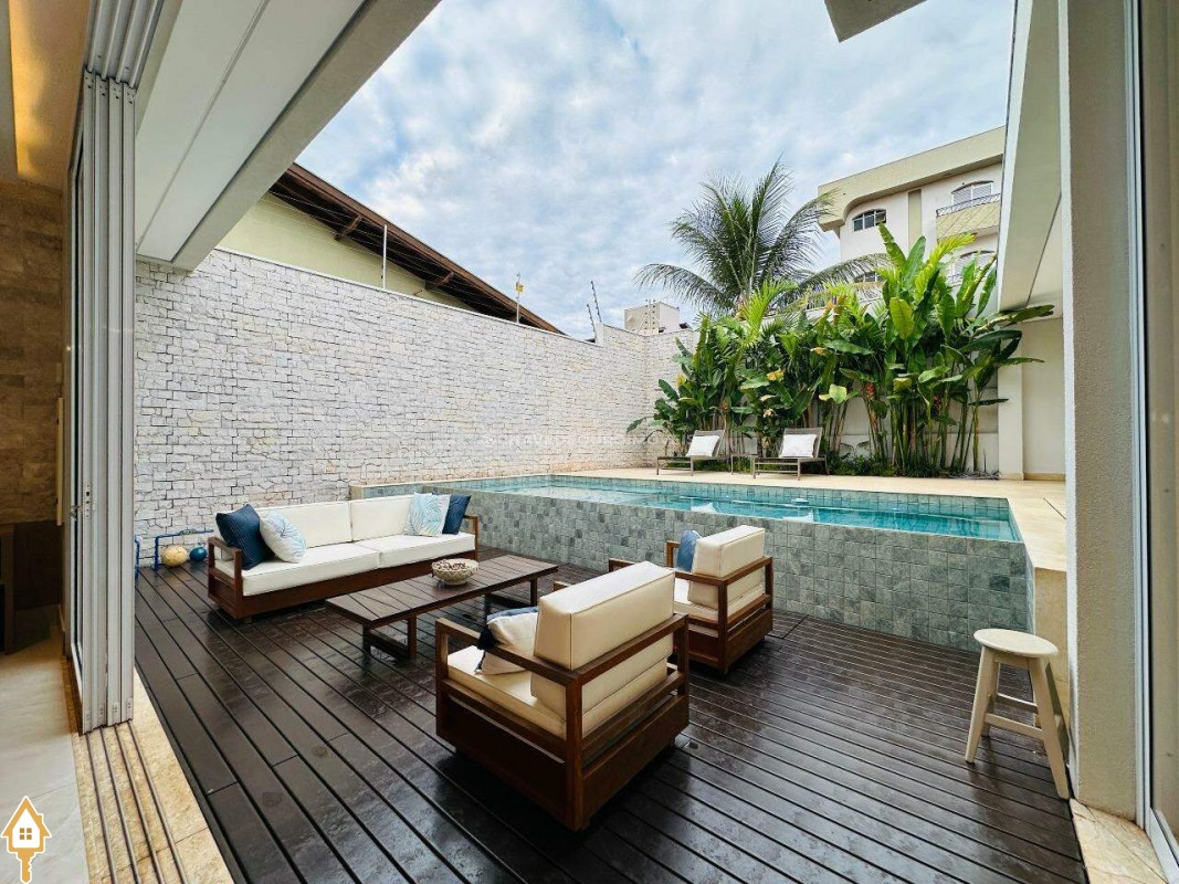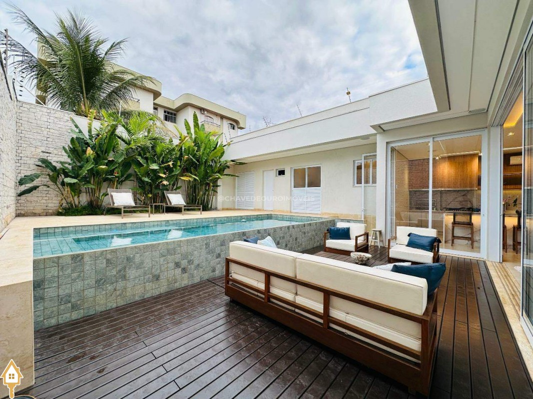 A varanda gourmet é um destaque à parte, com som embutido no teto, churrasqueira e bancada, perfeita para momentos de lazer e convivência. A área da piscina com borda infinita, deck de madeira e belo paisagismo completam o cenário.