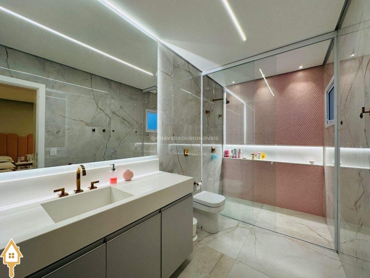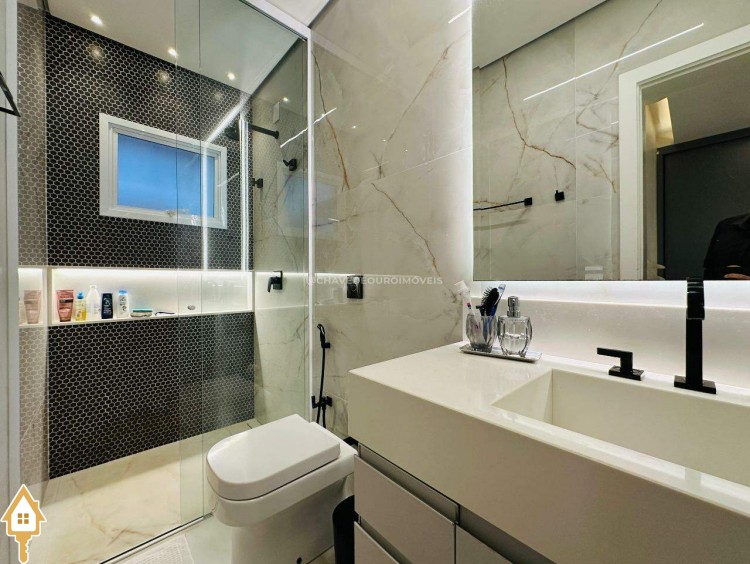 Todos os banheiros entregues com kits completos, incluindo box até o teto, metais e espelhos. O acabamento é de altíssimo padrão, com revestimentos nobres, iluminação planejada, gesso, marcenaria sob medida e portas premium.