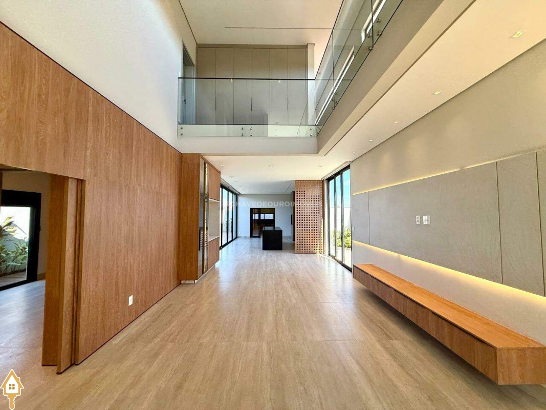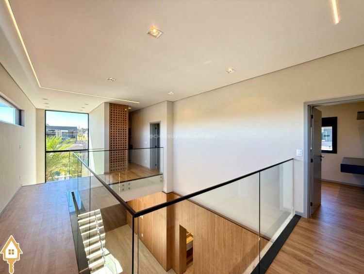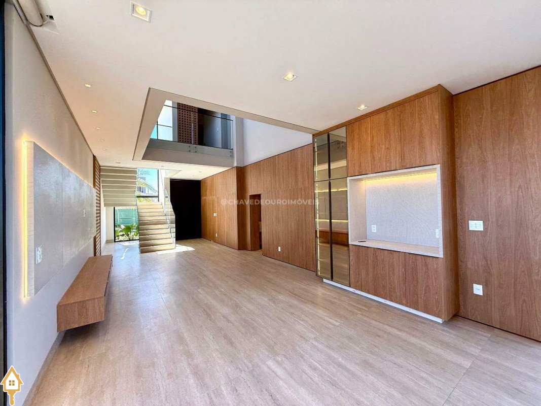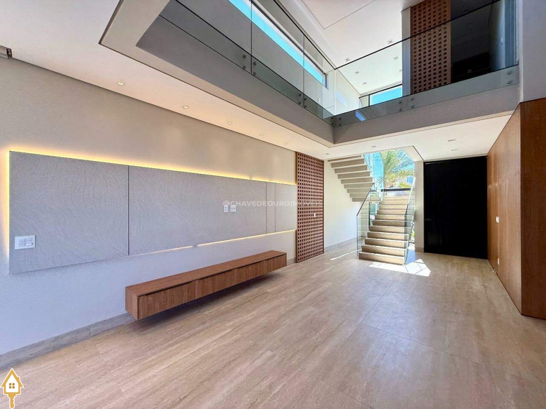 Ao entrar, você é recebido por uma sala de estar/TV com pé direito duplo de 6,5 metros e um mezanino. A sala de jantar integrada à varanda gourmet e a cozinha independente, com lavanderia e banheiro para funcionários, garantem praticidade. No andar superior, há quatro suítes, incluindo uma master com closet, além de um escritório que pode ser convertido em uma quinta suíte.