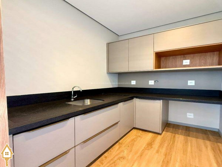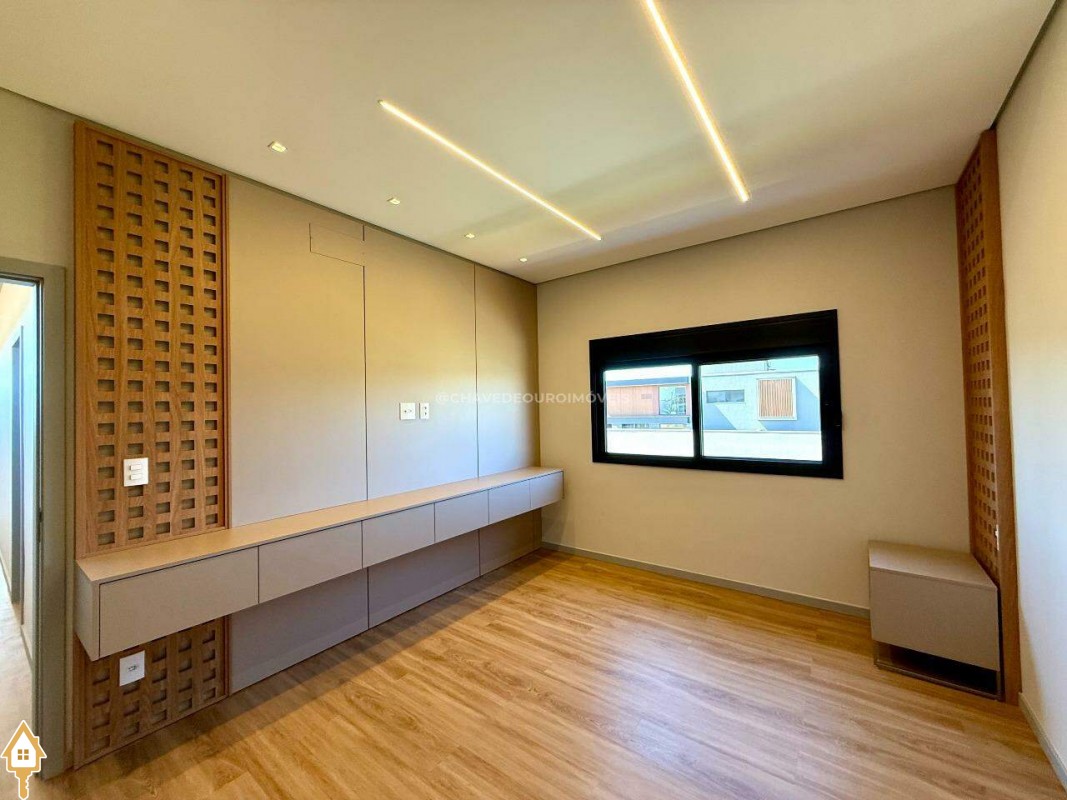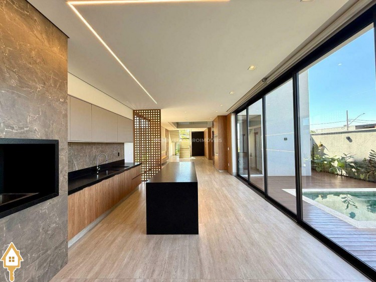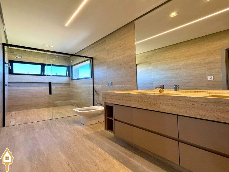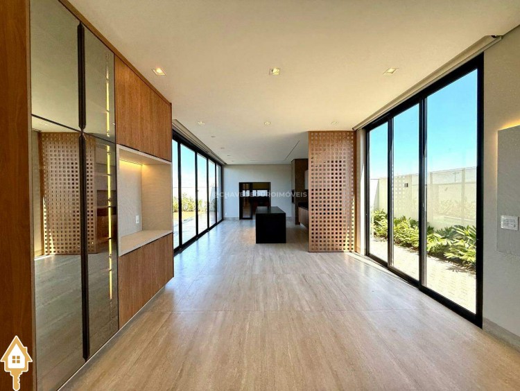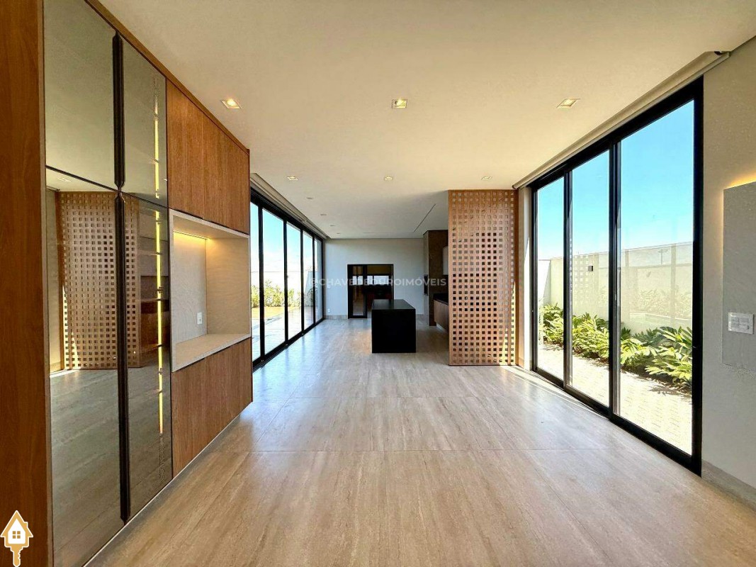 Ao entrar, você é recebido por uma sala de estar/TV com pé direito duplo de 6,5 metros e um mezanino. A sala de jantar integrada à varanda gourmet e a cozinha independente, com lavanderia e banheiro para funcionários, garantem praticidade. No andar superior, há quatro suítes, incluindo uma master com closet, além de um escritório que pode ser convertido em uma quinta suíte.