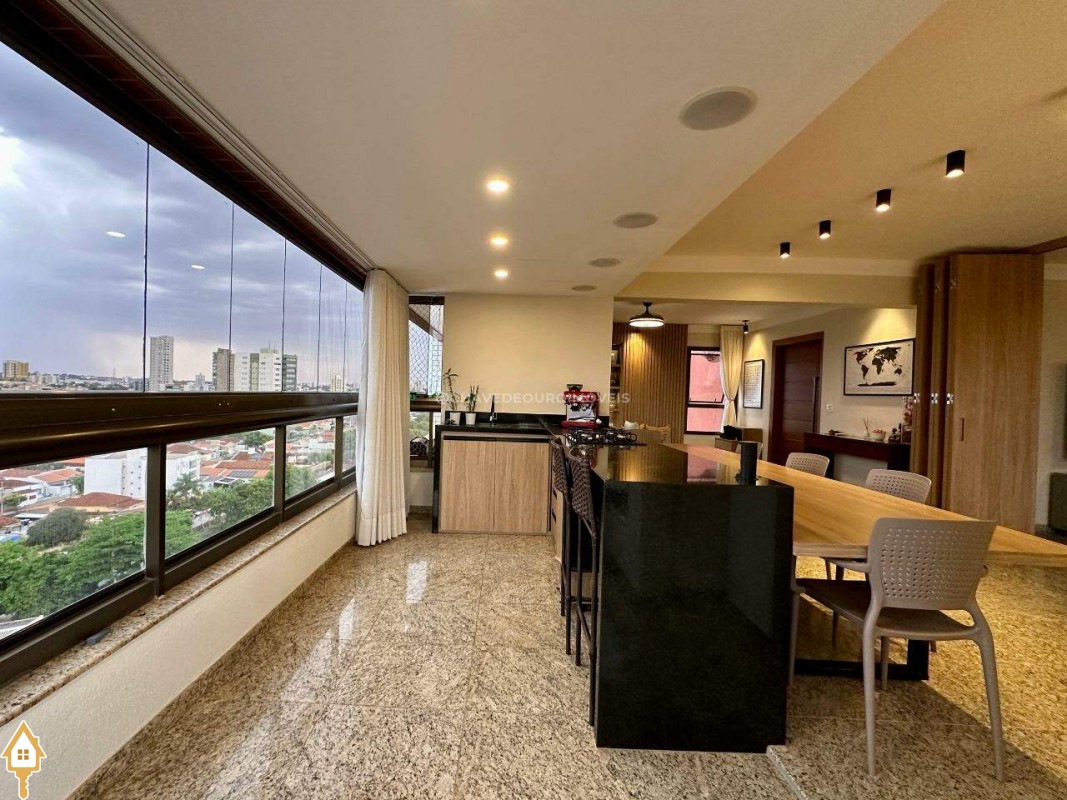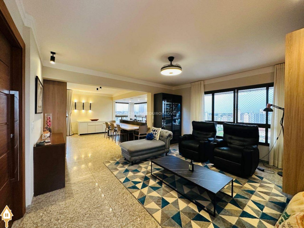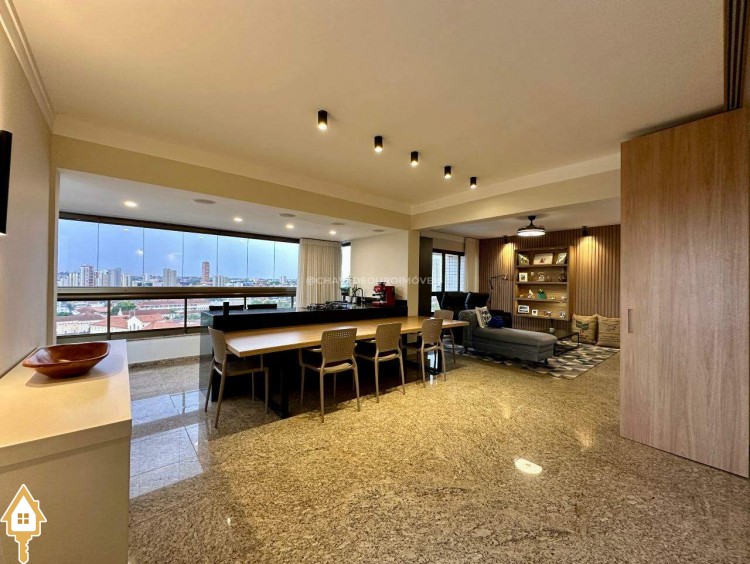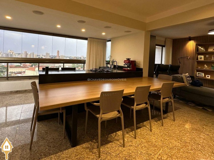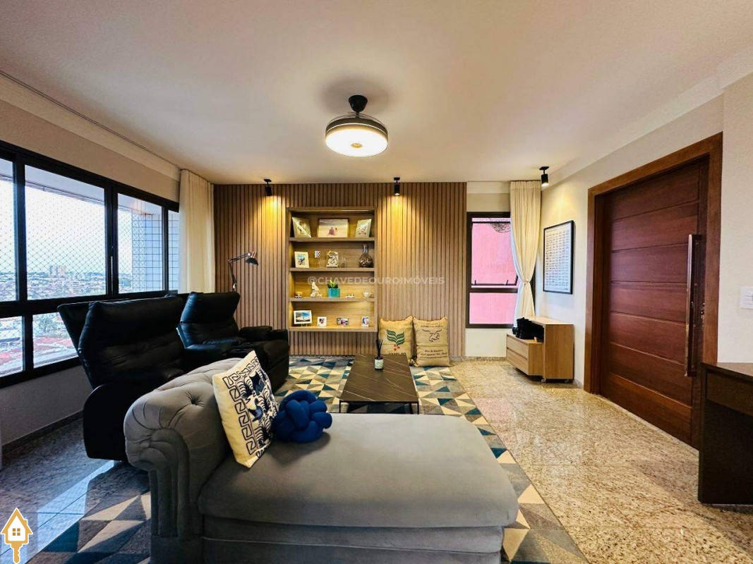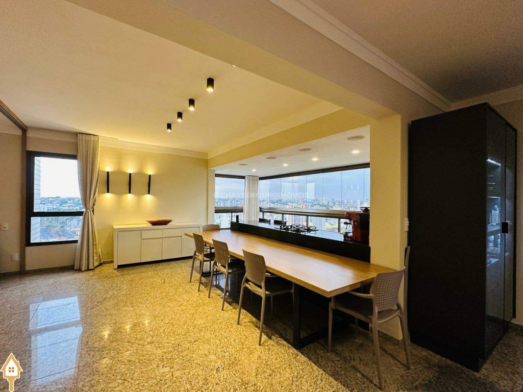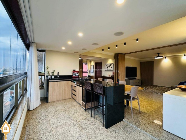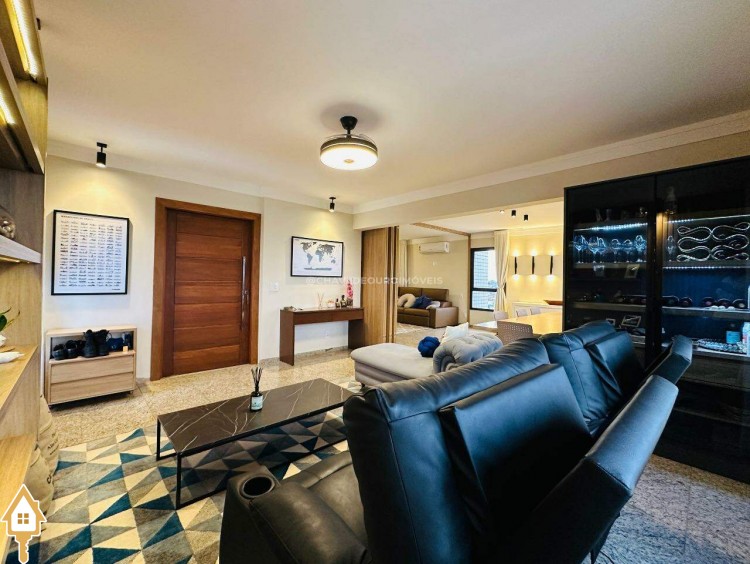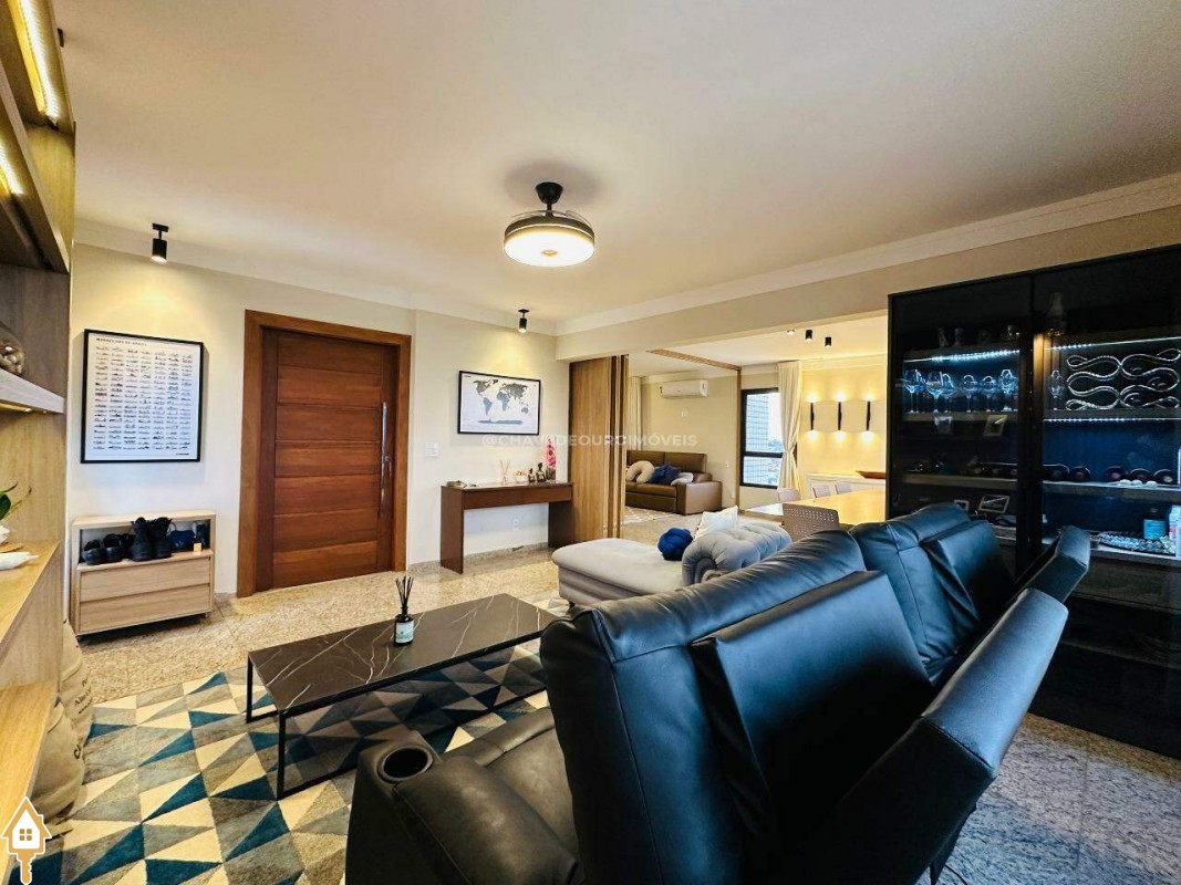 Na sala de estar, destacam-se a marcenaria de alto padrão e a iluminação planejada, criando um ambiente perfeito para receber convidados ou desfrutar de momentos de leitura tranquilos. Conectada à sala, a varanda gourmet oferece balcão de apoio, cooktop, pia, espaço para adega climatizada e uma vista panorâmica da cidade, em andar alto — cenário ideal para contemplar ou reunir os amigos.