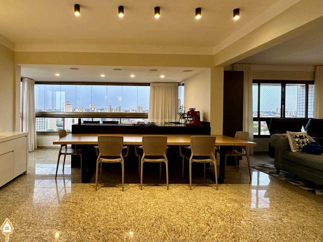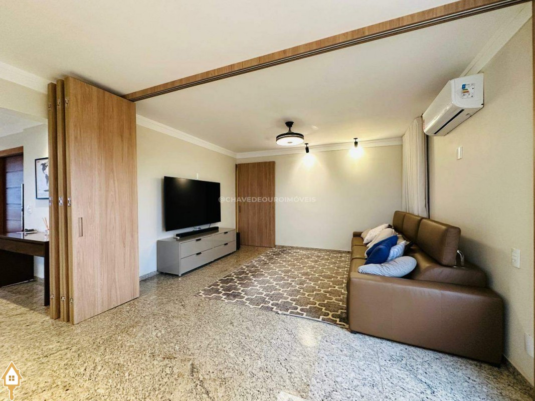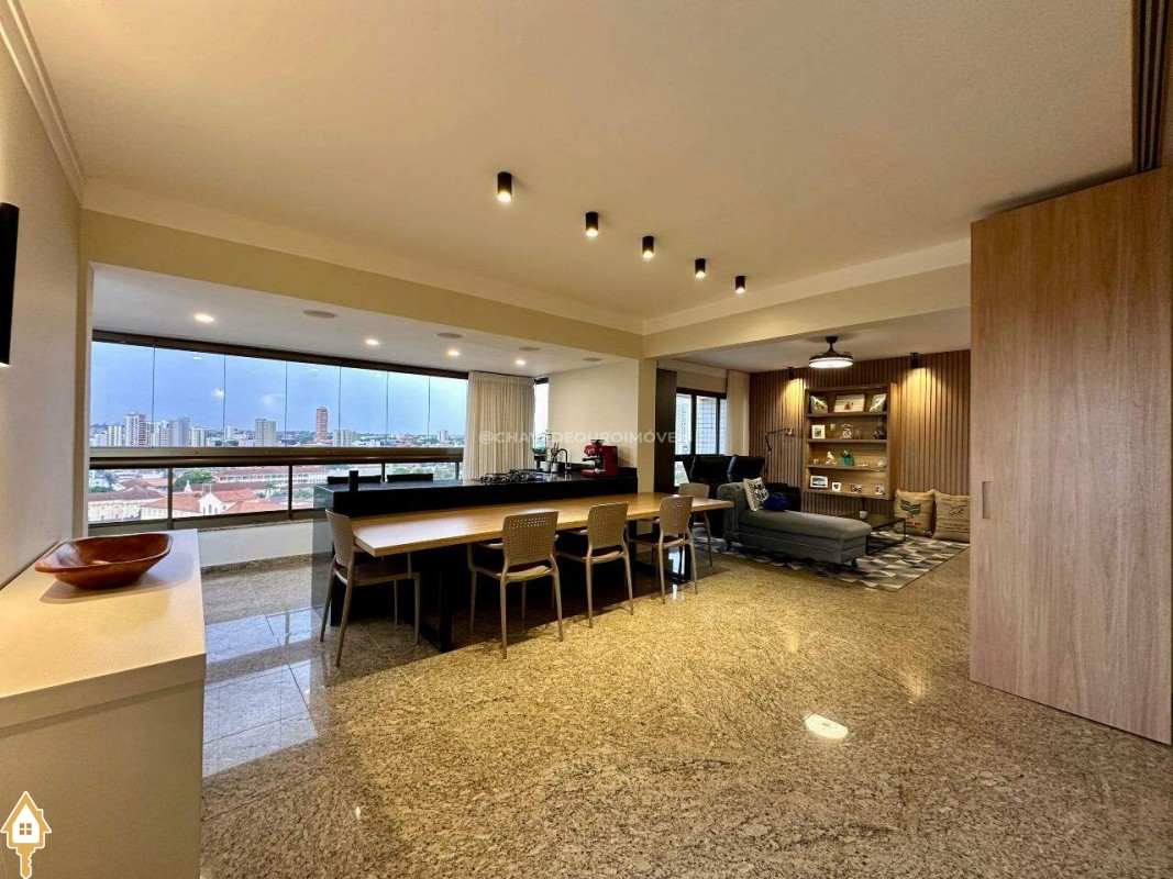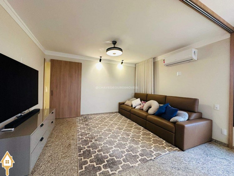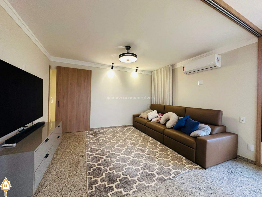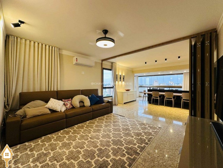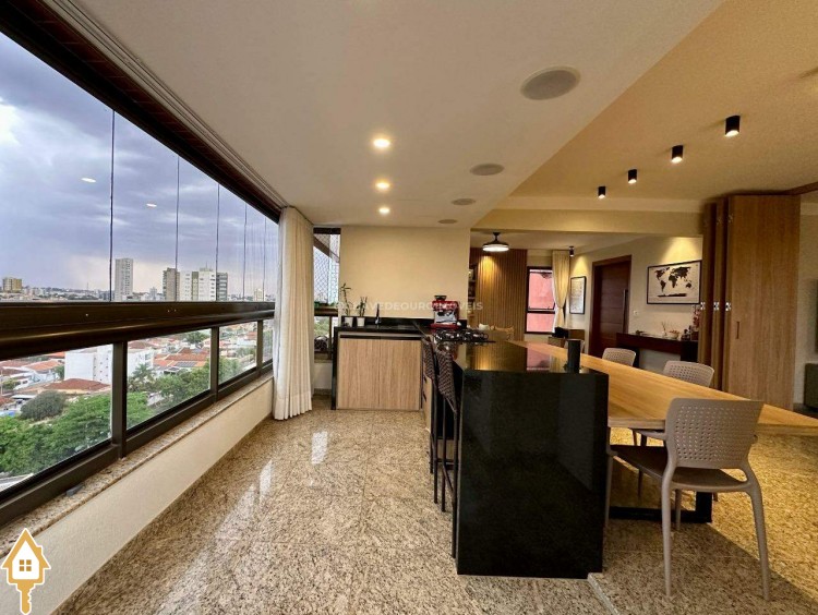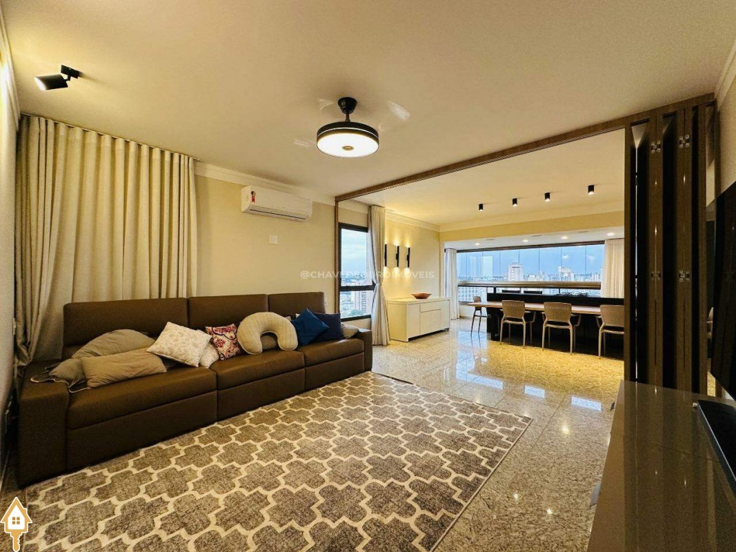 Na sala de estar, destacam-se a marcenaria de alto padrão e a iluminação planejada, criando um ambiente perfeito para receber convidados ou desfrutar de momentos de leitura tranquilos. Conectada à sala, a varanda gourmet oferece balcão de apoio, cooktop, pia, espaço para adega climatizada e uma vista panorâmica da cidade, em andar alto — cenário ideal para contemplar ou reunir os amigos.