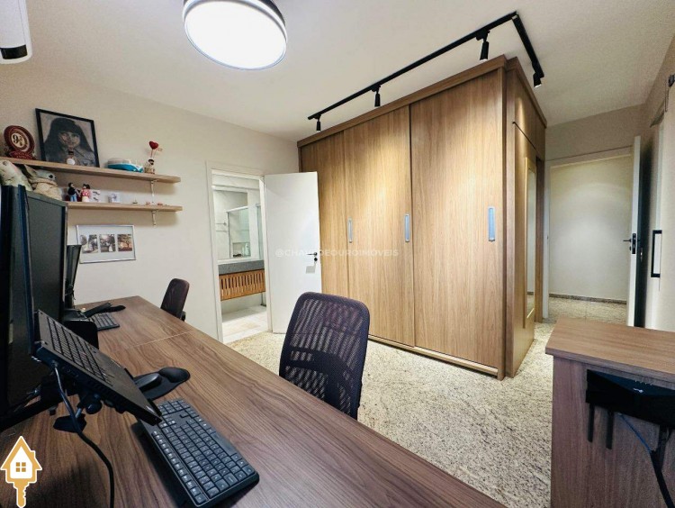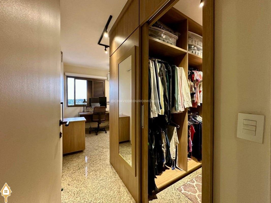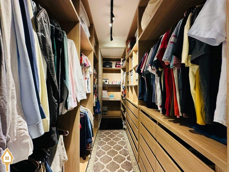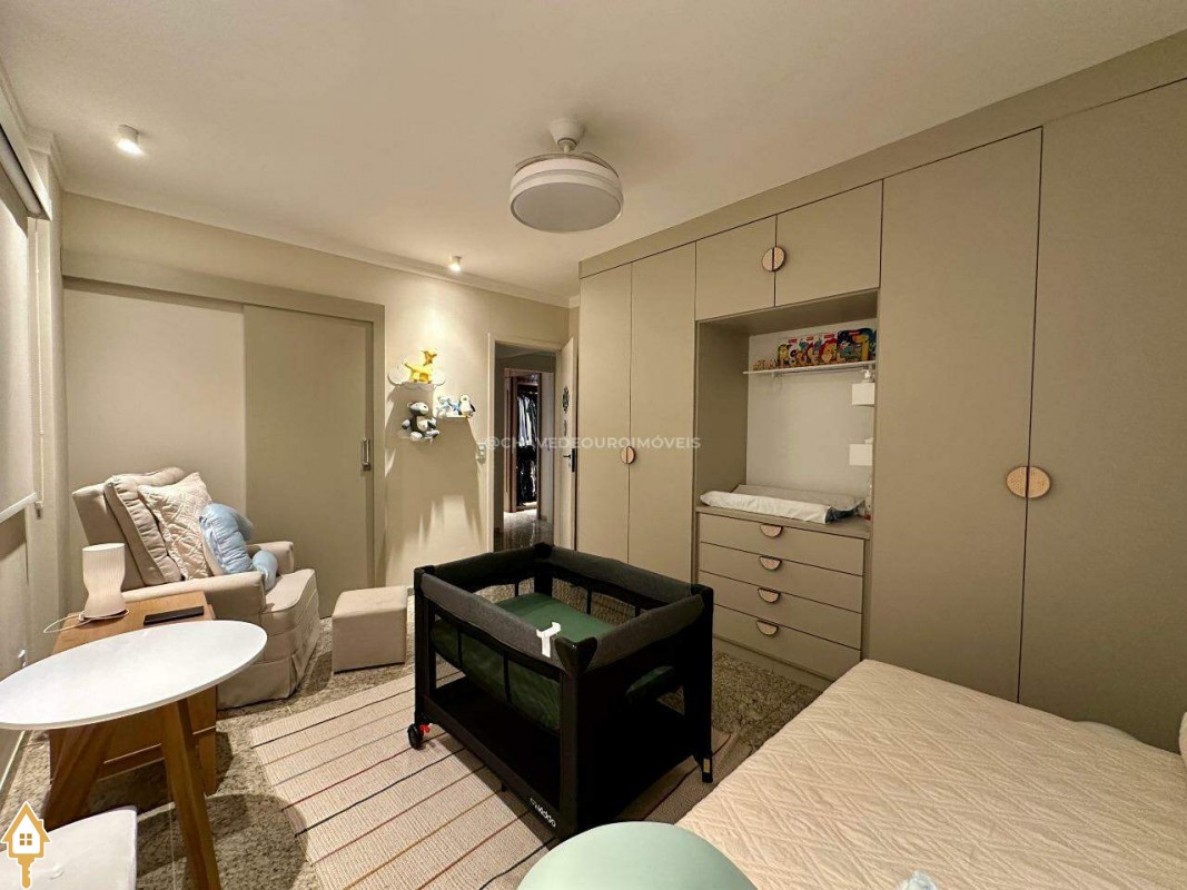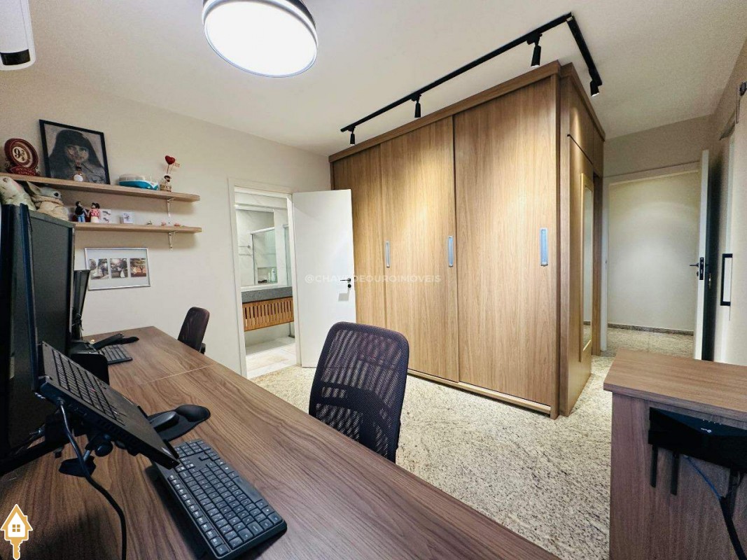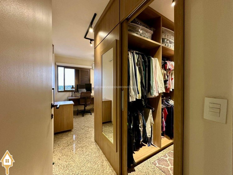 A planta original oferece quatro suítes completas, mas os proprietários optaram por transformar uma delas em closet e escritório, integrados à suíte principal. Atualmente, o apartamento conta com três suítes climatizadas, todas com armários planejados, mas há possibilidade de reversão à configuração original. Um lavabo complementa as áreas sociais.