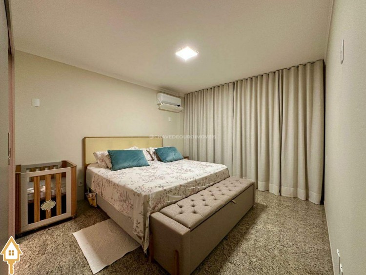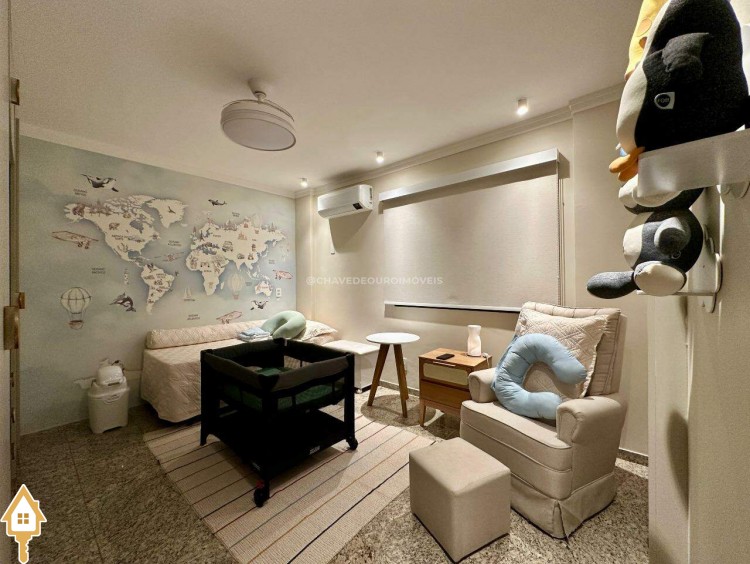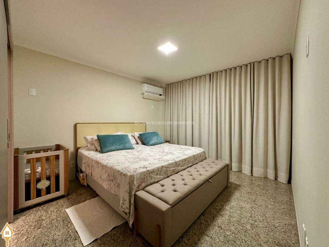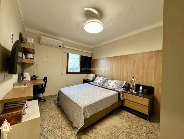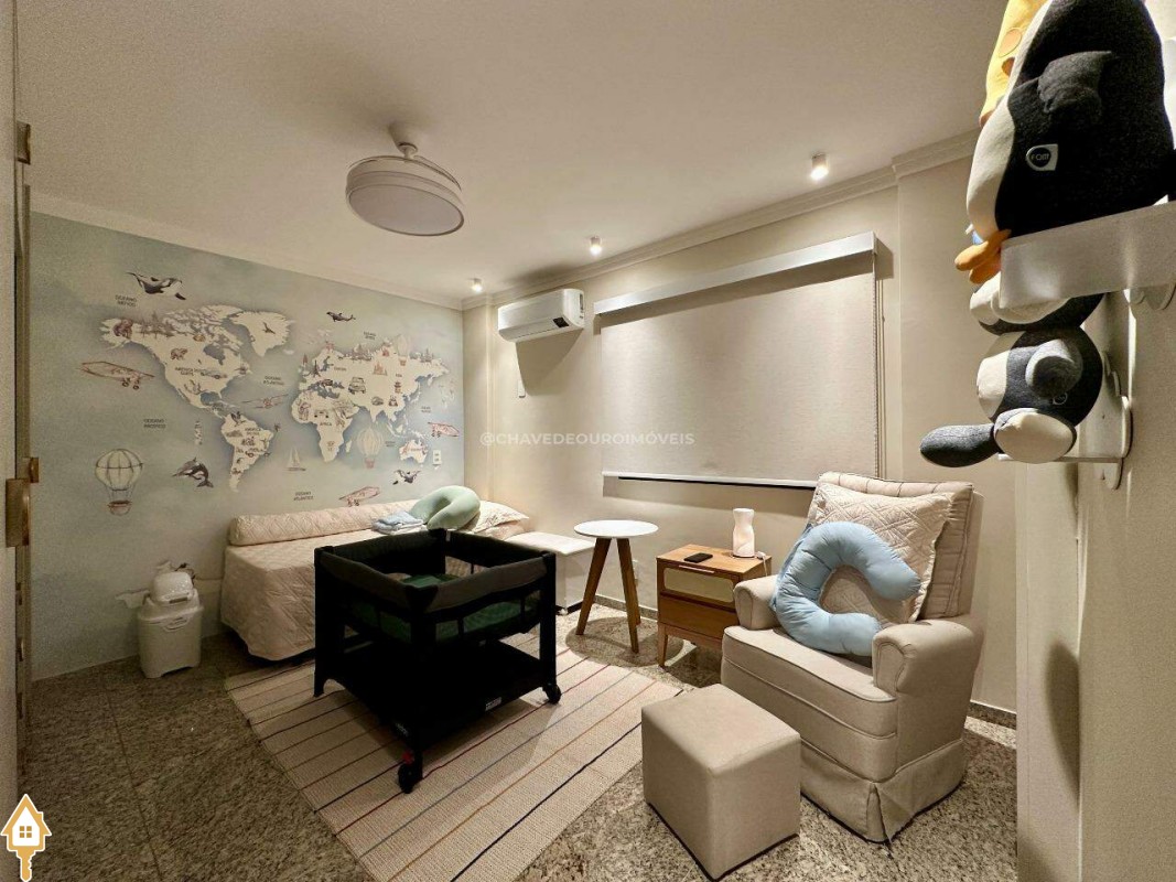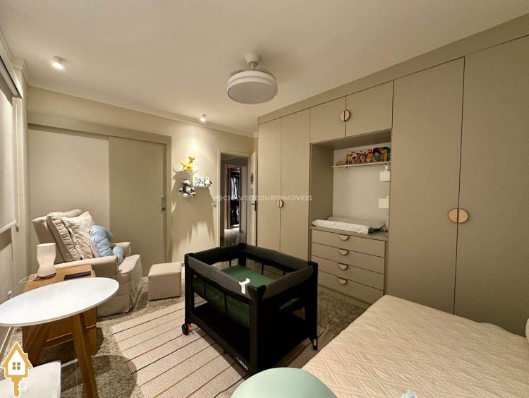 A planta original oferece quatro suítes completas, mas os proprietários optaram por transformar uma delas em closet e escritório, integrados à suíte principal. Atualmente, o apartamento conta com três suítes climatizadas, todas com armários planejados, mas há possibilidade de reversão à configuração original. Um lavabo complementa as áreas sociais.