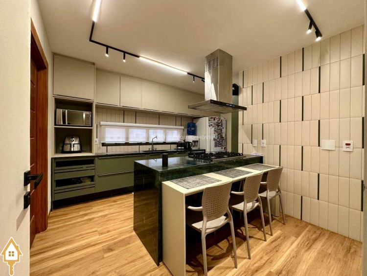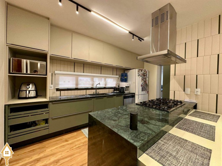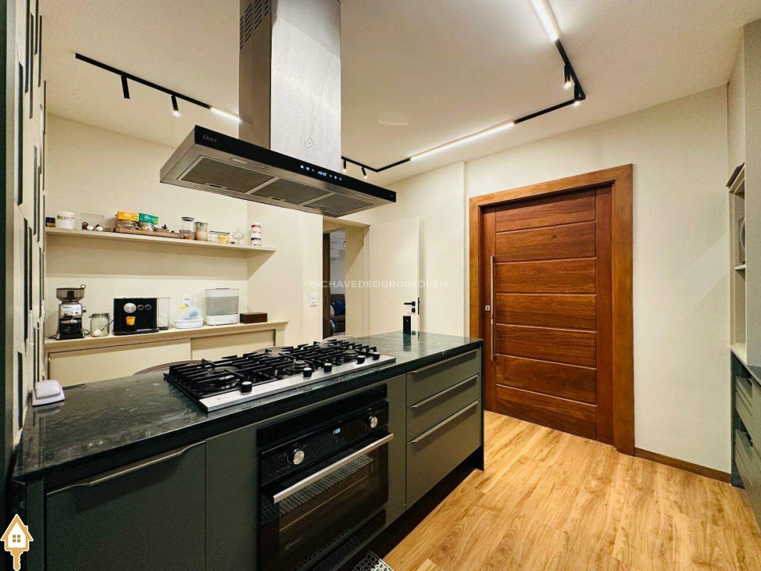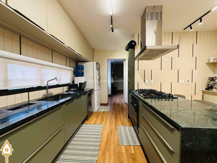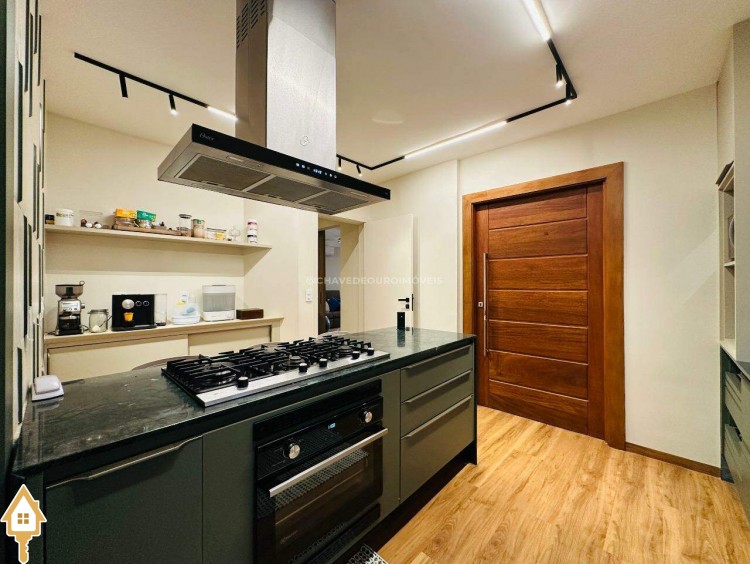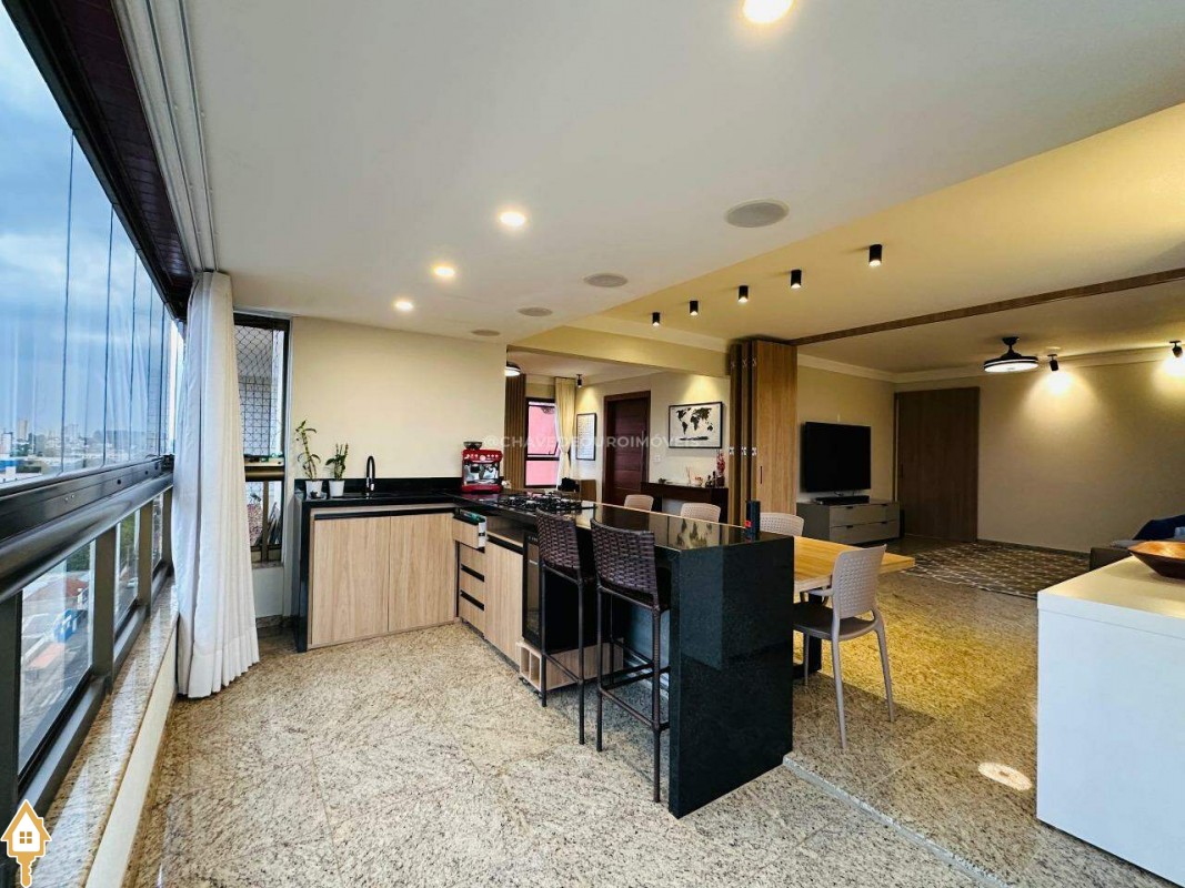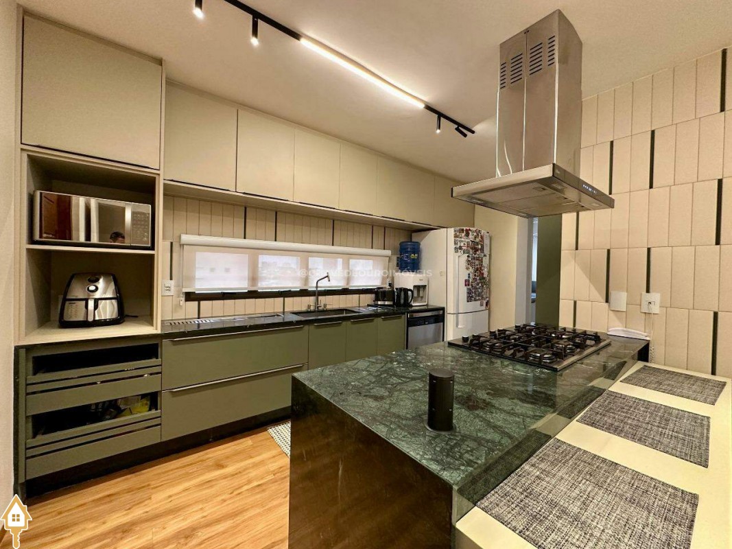 Um fechamento sanfonado em marcenaria integra a varanda a uma ampla e aconchegante sala de TV, proporcionando privacidade e conforto. A cozinha é um charme à parte: bem planejada, funcional e de excelente qualidade, conta com ilha central equipada com cooktop Fischer, depurador de ar, forno, espaço para lava-louças e abundante marcenaria.