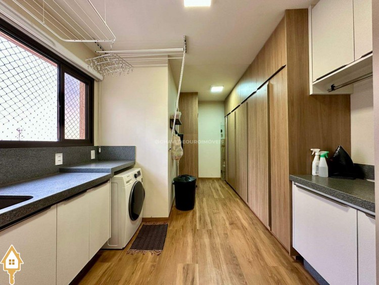 Na sequência, a lavanderia é ampla e organizada, com diversos armários planejados, área para secagem e depósito, perfeita para manter a rotina prática e funcional.