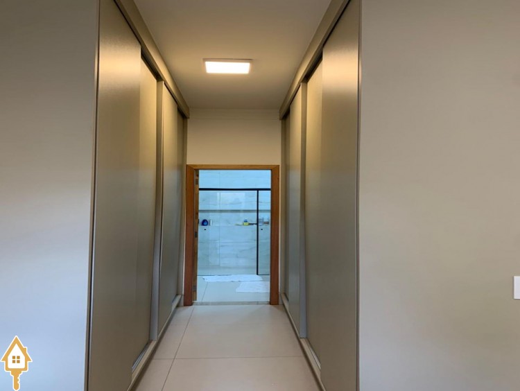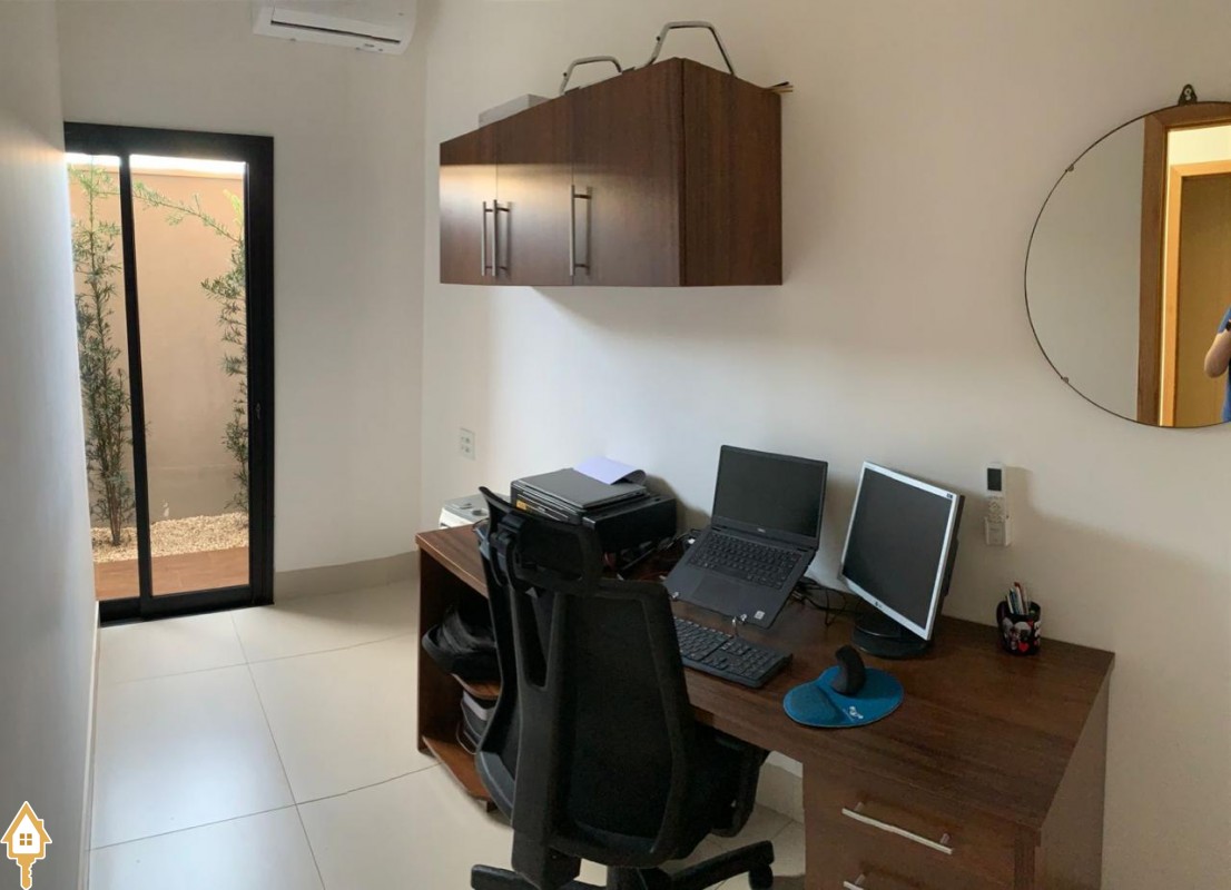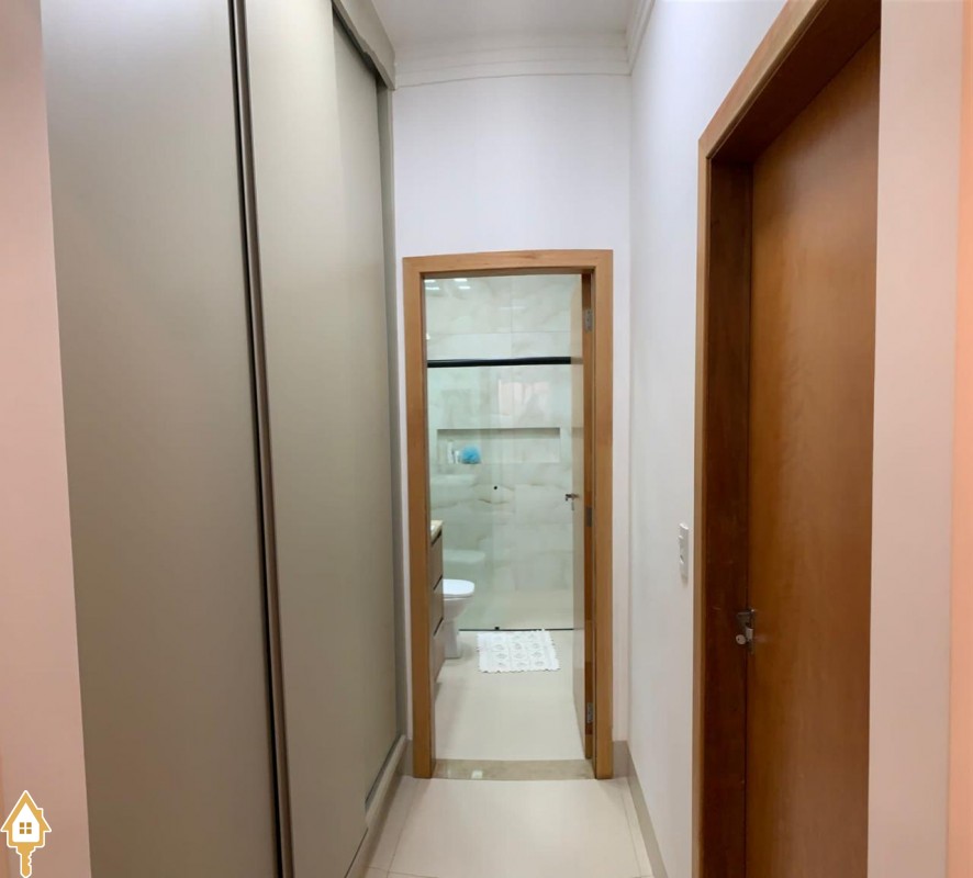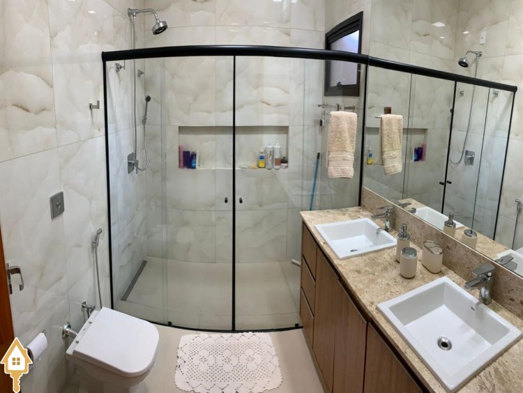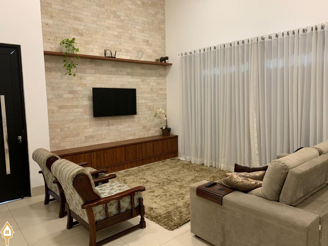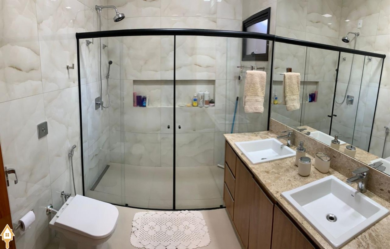 Descrição do Imóvel 04 quartos, todos com banheiro privativo e guarda-roupas planejados 02 escritórios separados por drywall em um dos quartos reversíveis Ambientes climatizados (quartos e escritórios) com controle via aplicativo 04 vagas de garagem, sendo 02 cobertas Armário roupeiro adicional para organização Sala ampla com pé direito duplo e parede de acabamento em pedra na área da TV Cozinha equipada com armários planejados Área gourmet com churrasqueira integrada à cozinha Área lateral coberta por toldo automatizado Sistema de aquecimento de água fotovoltaico com boiler de 600 litros Sistema de pressurização para água quente e fria