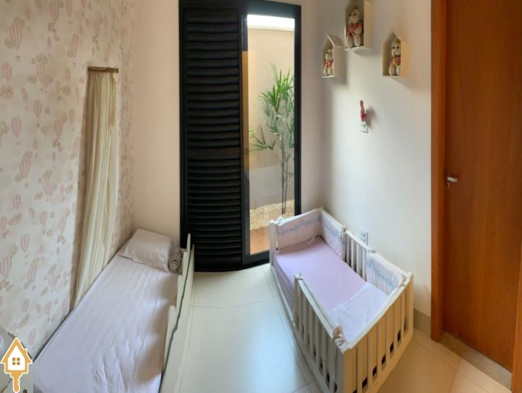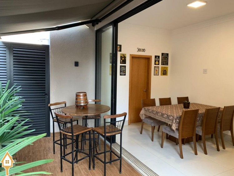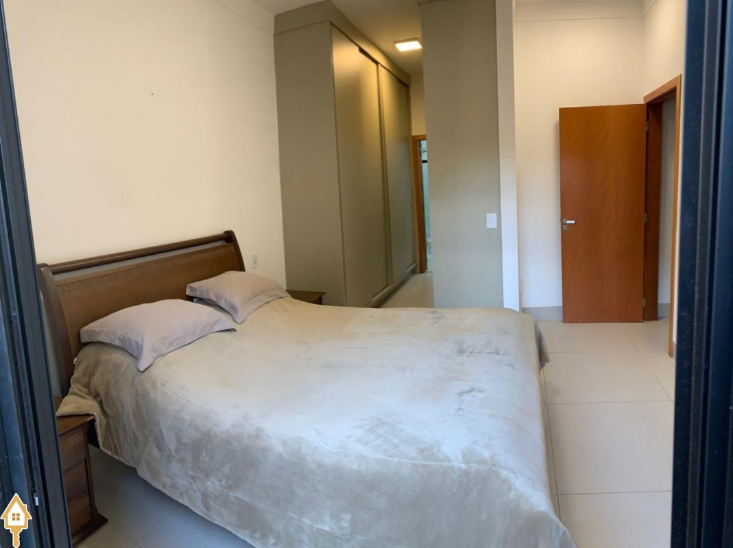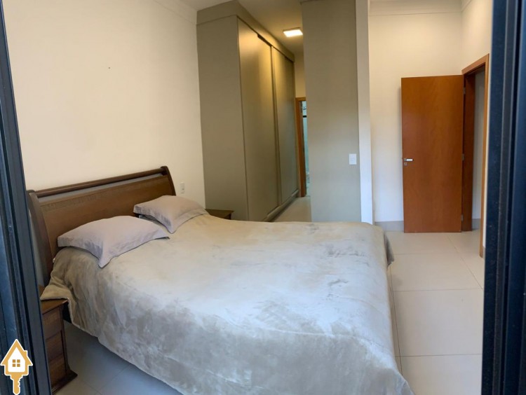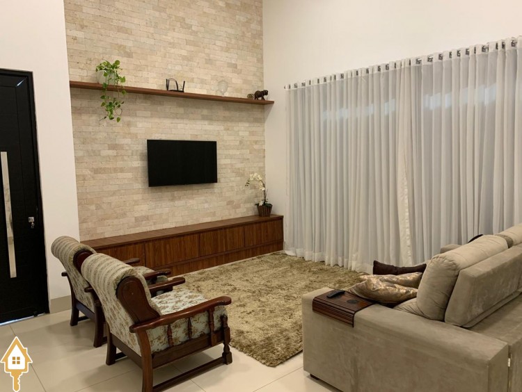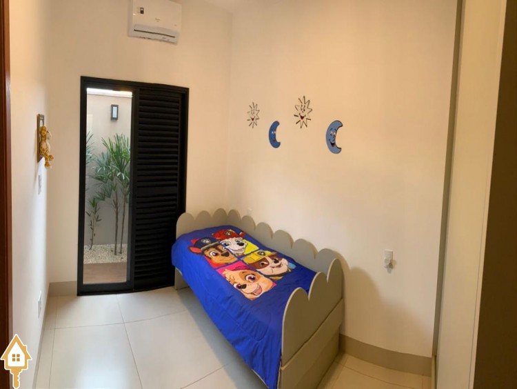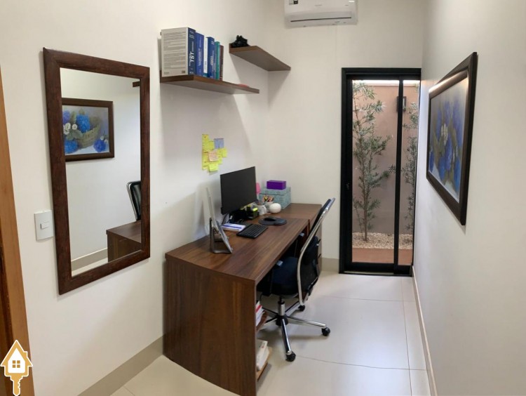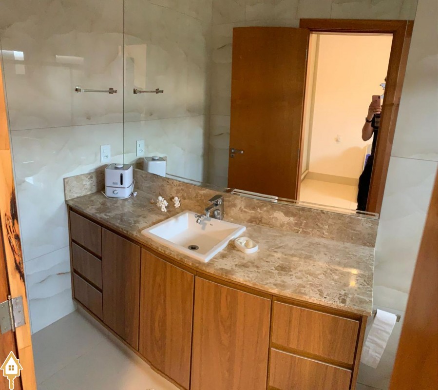 Descrição do Imóvel 04 quartos, todos com banheiro privativo e guarda-roupas planejados 02 escritórios separados por drywall em um dos quartos reversíveis Ambientes climatizados (quartos e escritórios) com controle via aplicativo 04 vagas de garagem, sendo 02 cobertas Armário roupeiro adicional para organização Sala ampla com pé direito duplo e parede de acabamento em pedra na área da TV Cozinha equipada com armários planejados Área gourmet com churrasqueira integrada à cozinha Área lateral coberta por toldo automatizado Sistema de aquecimento de água fotovoltaico com boiler de 600 litros Sistema de pressurização para água quente e fria