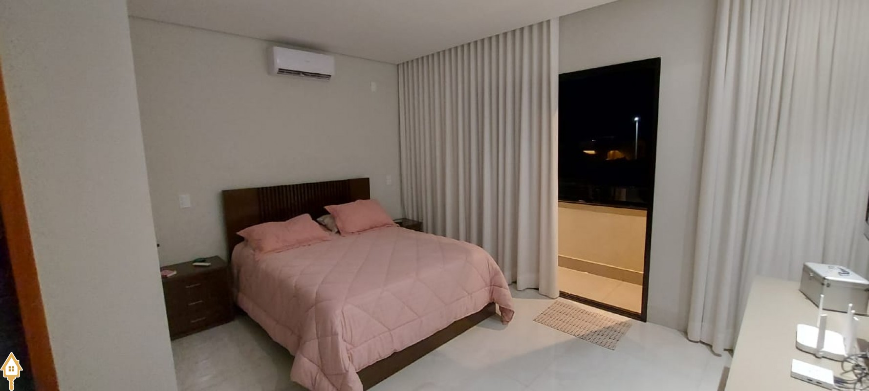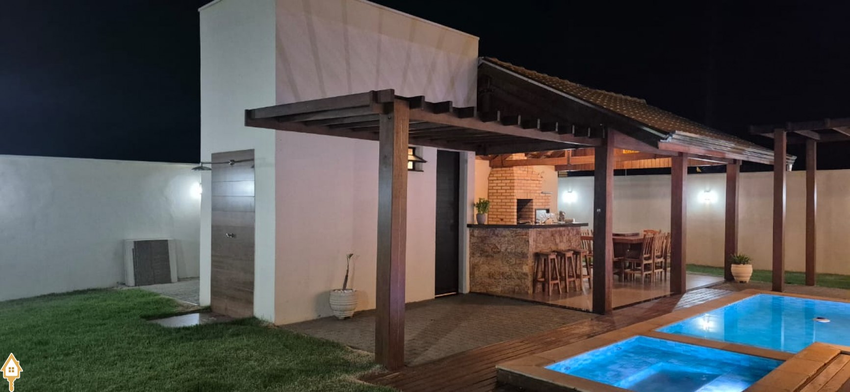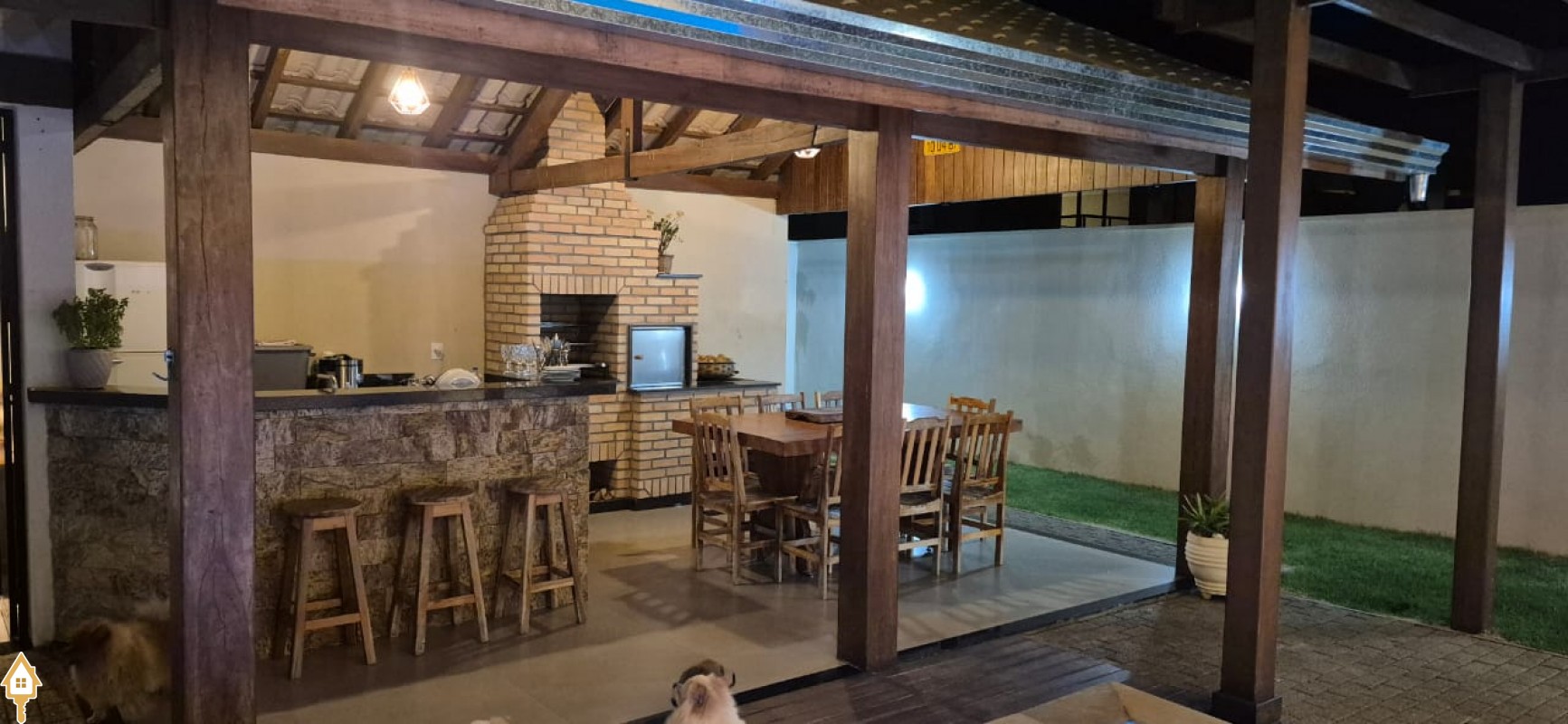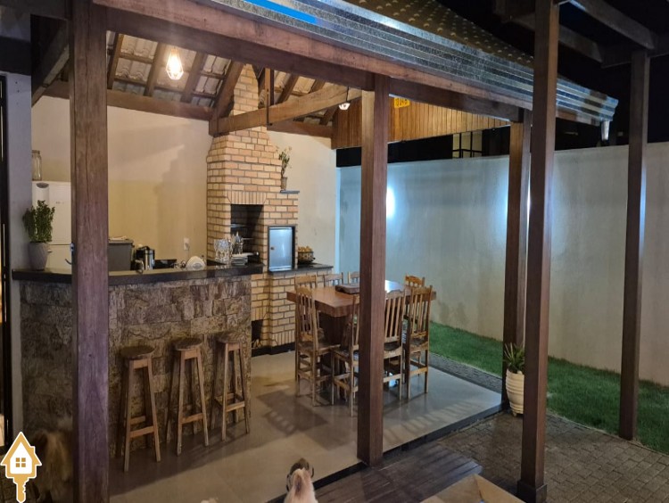 Descrição: Casa com 298m² de área construída Localização privilegiada: de frente à praça principal Casa de esquina com passarela de pedestres Dois pavimentos em lote de 482,5m² Garagem para 4 carros Sala ampla com pé direito duplo Cozinha com mesa fixa e dispensa de apoio Lavabo Escritório que pode ser utilizado como suíte inferior Lavanderia 1 suíte master com closet e sacada 2 suítes americanas Sala de TV Sacada voltada para a praça Escada em madeira com estrutura metálica Amplo corredor de acesso aos ambientes Área de jardinagem superior Piscina Banheira de hidromassagem Sauna Banheiro na área de lazer Quiosque Churrasqueira, fogão e forno de lenha Ducha Dispensa externa para apoio e guarda de materiais Amplo quintal