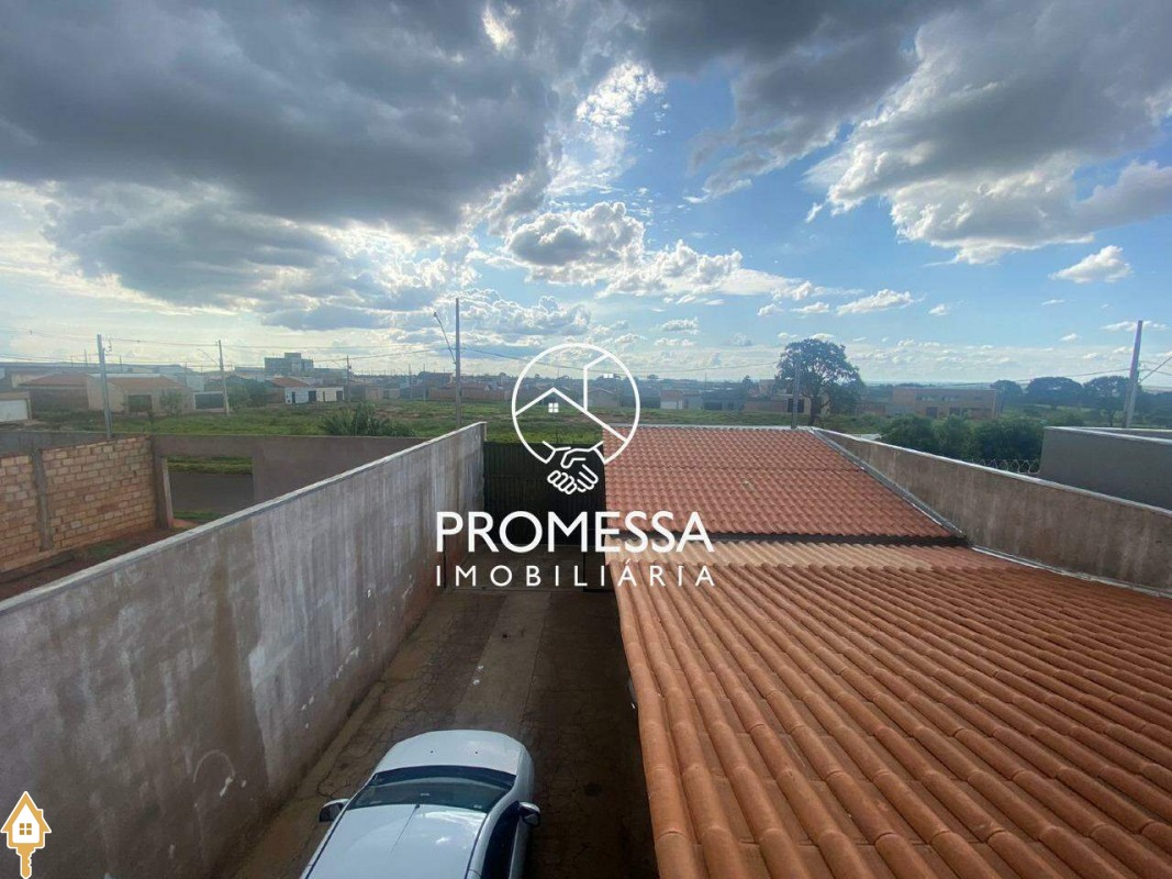 Casa de morada com 02 quartos no piso superior com 01 suíte, sala ampla, cozinha, banheiro social, área de serviço, canil, varanda e garagem coberta.