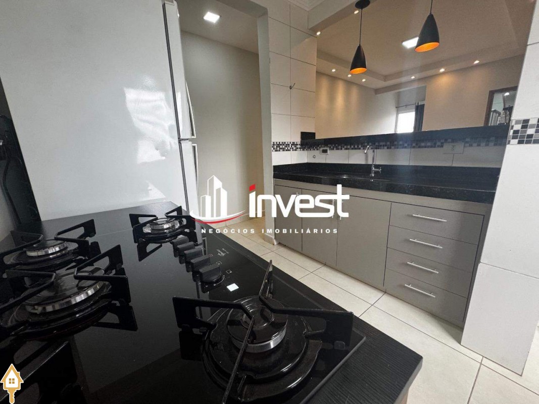 - Cozinha americana com armários, cooktop e geladeira