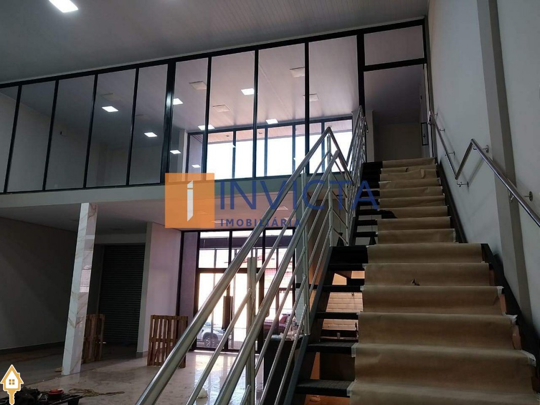 Galpão comercial de 352,7 m², com infraestrutura completa: amplo salão de 18x12 com pé direito de 6 metros, equipado com ar condicionado e forro, além de uma recepção com 2 banheiros adaptados para acessibilidade, copa, cozinha, DML, mais 2 banheiros internos e um mezanino, estacionamento frontal