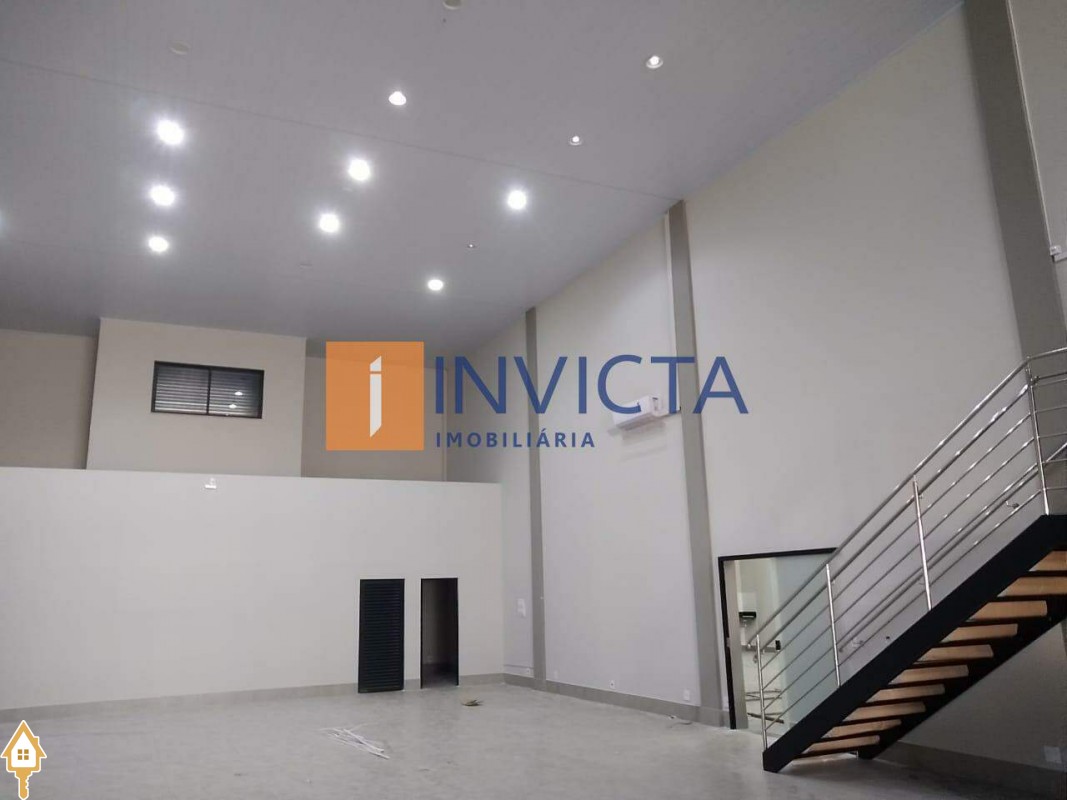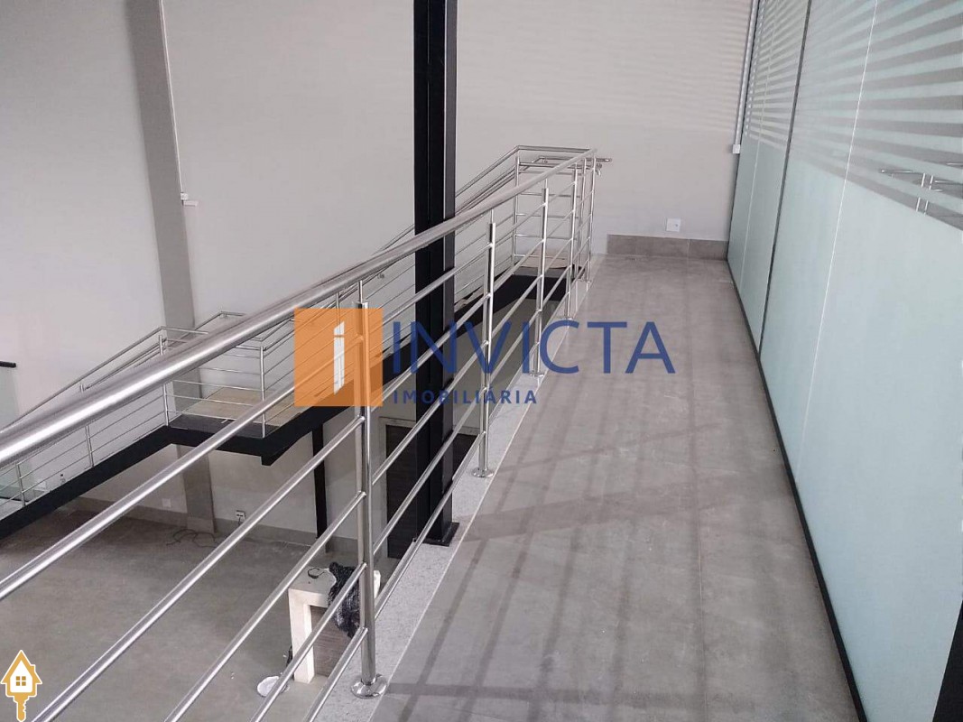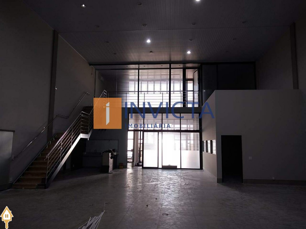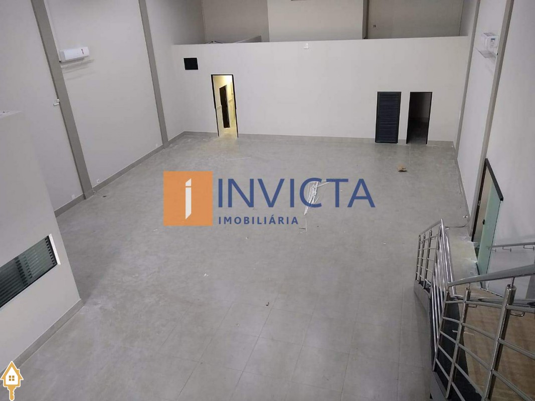Galpão comercial de 352,7 m², com infraestrutura completa: amplo salão de 18x12 com pé direito de 6 metros, equipado com ar condicionado e forro, além de uma recepção com 2 banheiros adaptados para acessibilidade, copa, cozinha, DML, mais 2 banheiros internos e um mezanino, estacionamento frontal