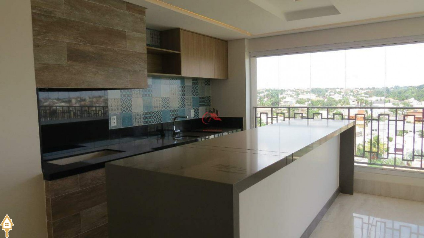 - Varanda gourmet com bancada com acabamento modificado e armários na bancada da pia e superior;