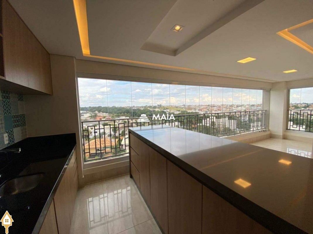 - Varanda gourmet com bancada com acabamento modificado e armários na bancada da pia e superior;