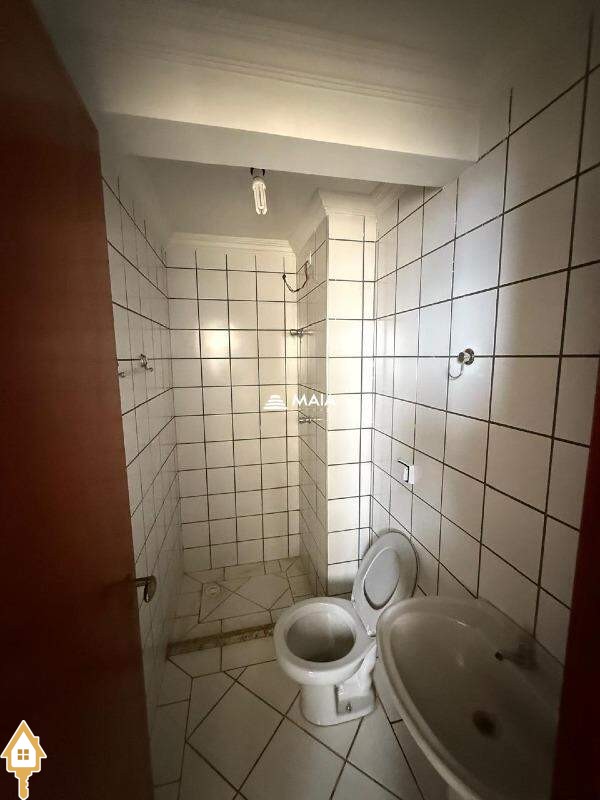 - Banheiro social com box, espelho e armário.