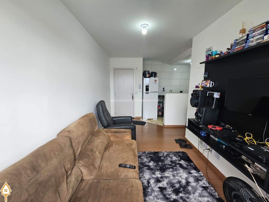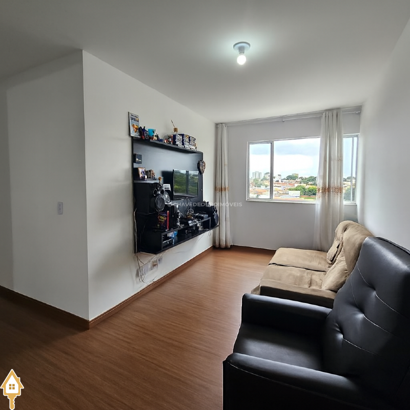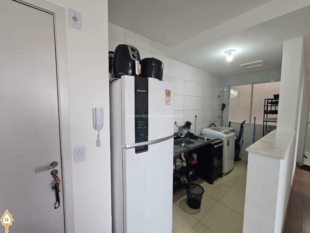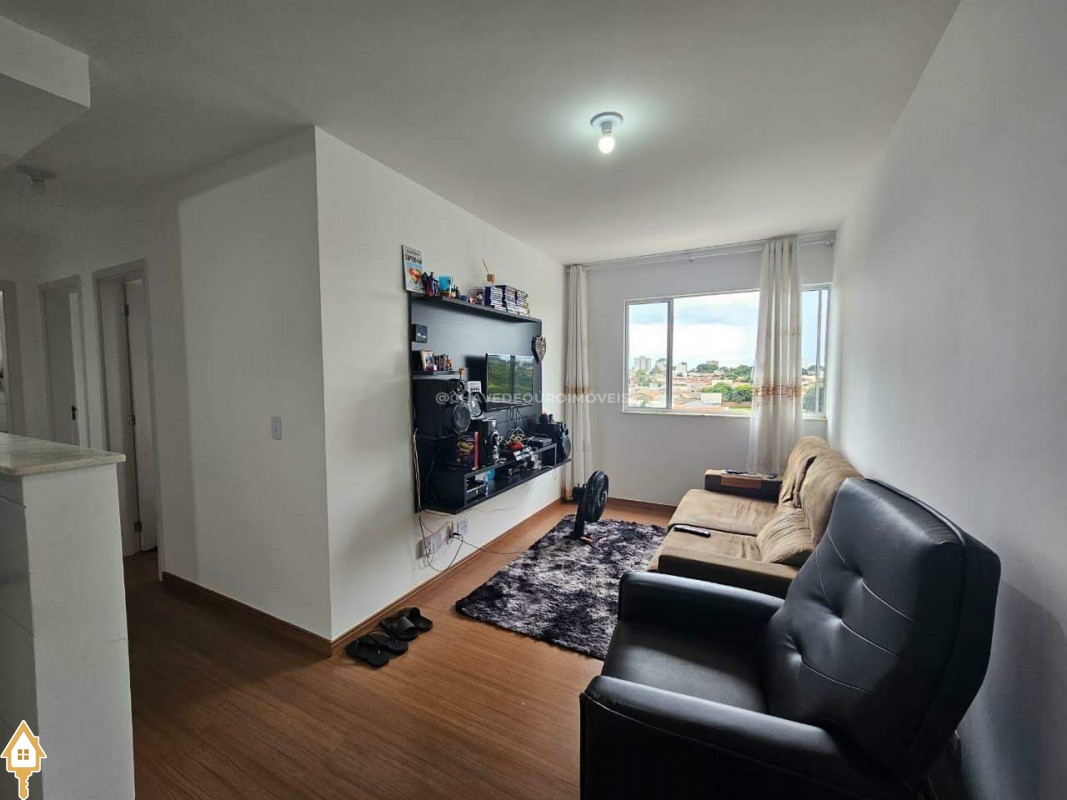 Apartamento moniliado no condomínio Unique Uberaba I com dois quartos, banheiro social, sala de estar, cozinha integrada com área de serviço e uma vaga de garagem.
