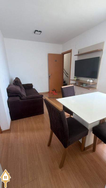 - Sala mobiliada com sofá, painel, mesa de jantar e TV