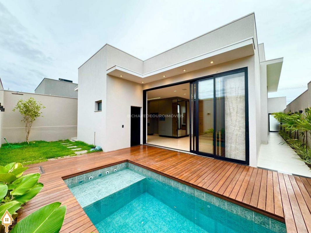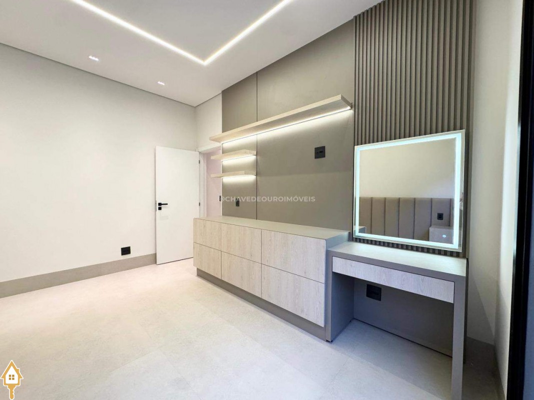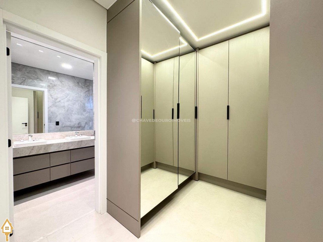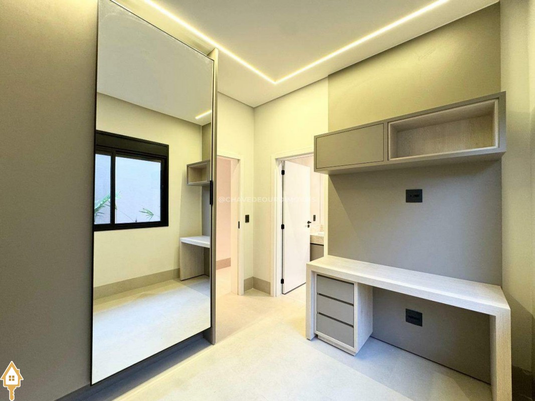 São 3 suítes, incluindo suíte principal com closet amplo. A casa também possui escritório com esquadria automatizada e lavabo anexo. A área externa conta com piscina aquecida com ilha e hidromassagem, além de paisagismo com irrigação automatizada.