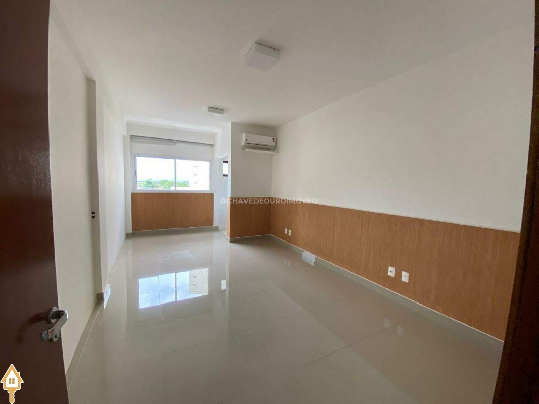 Sala com banheiro, ar condicionado instalado, persianas e uma vaga de garagem.