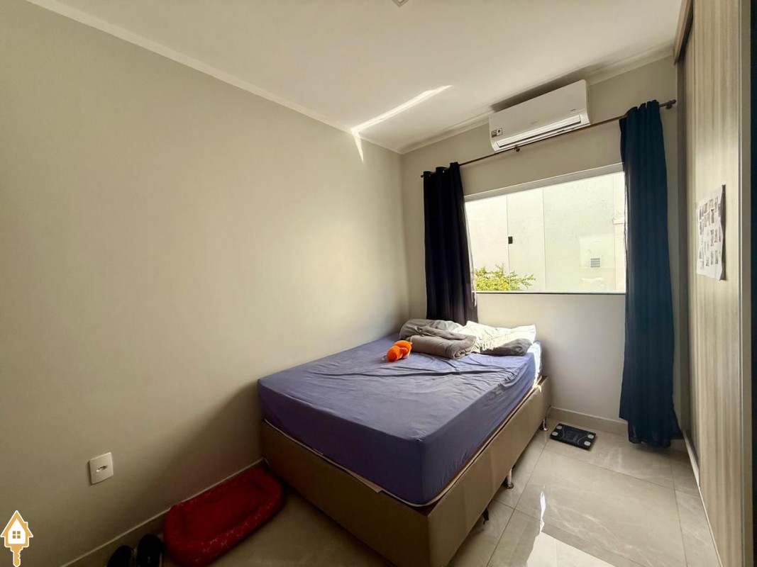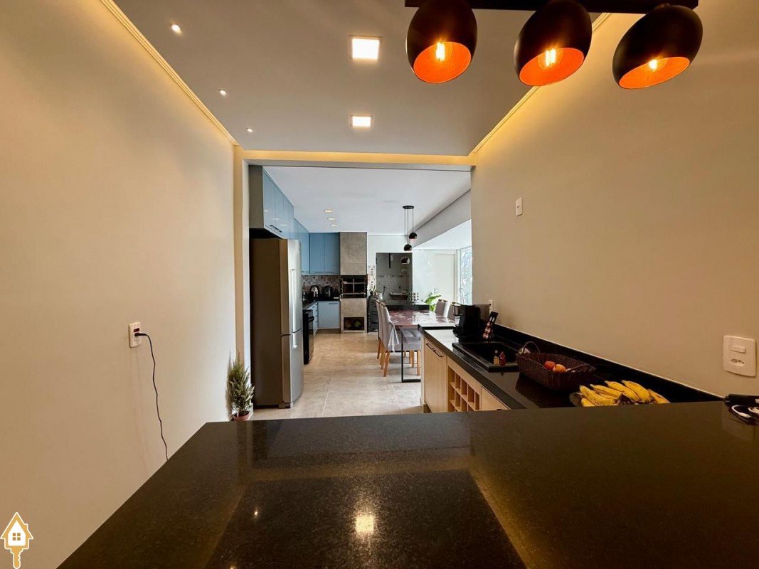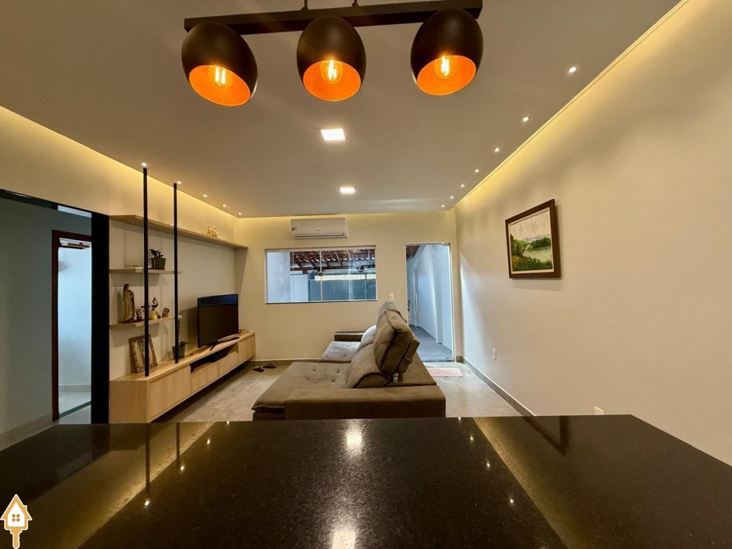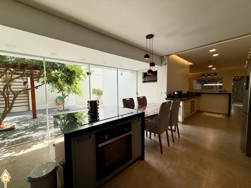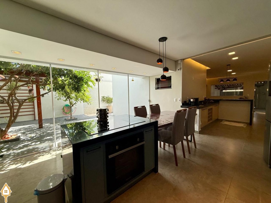 Casa à venda composta por três quartos, sendo um deles suíte, com ar-condicionado instalado em dois dos dormitórios. Conta com sala integrada à cozinha e à varanda gourmet com churrasqueira, todos os ambientes com marcenaria planejada e iluminação completa.