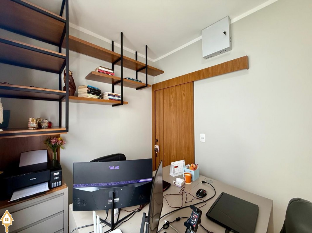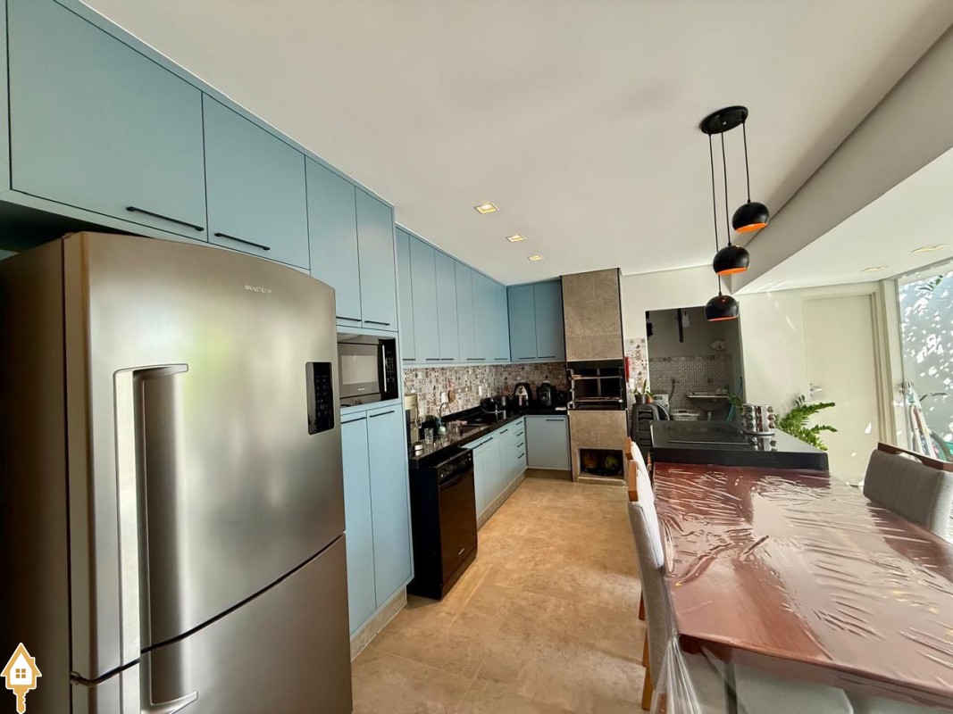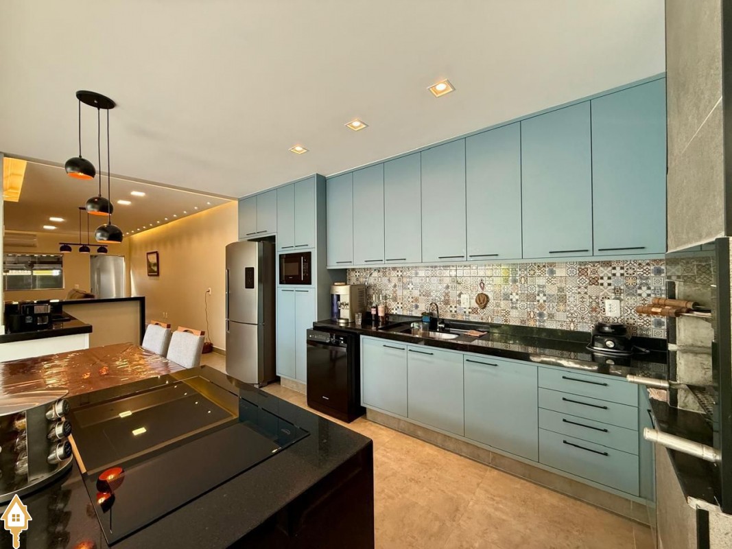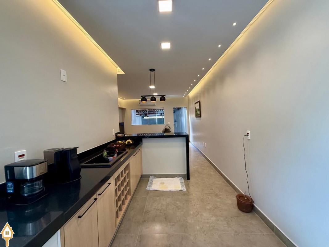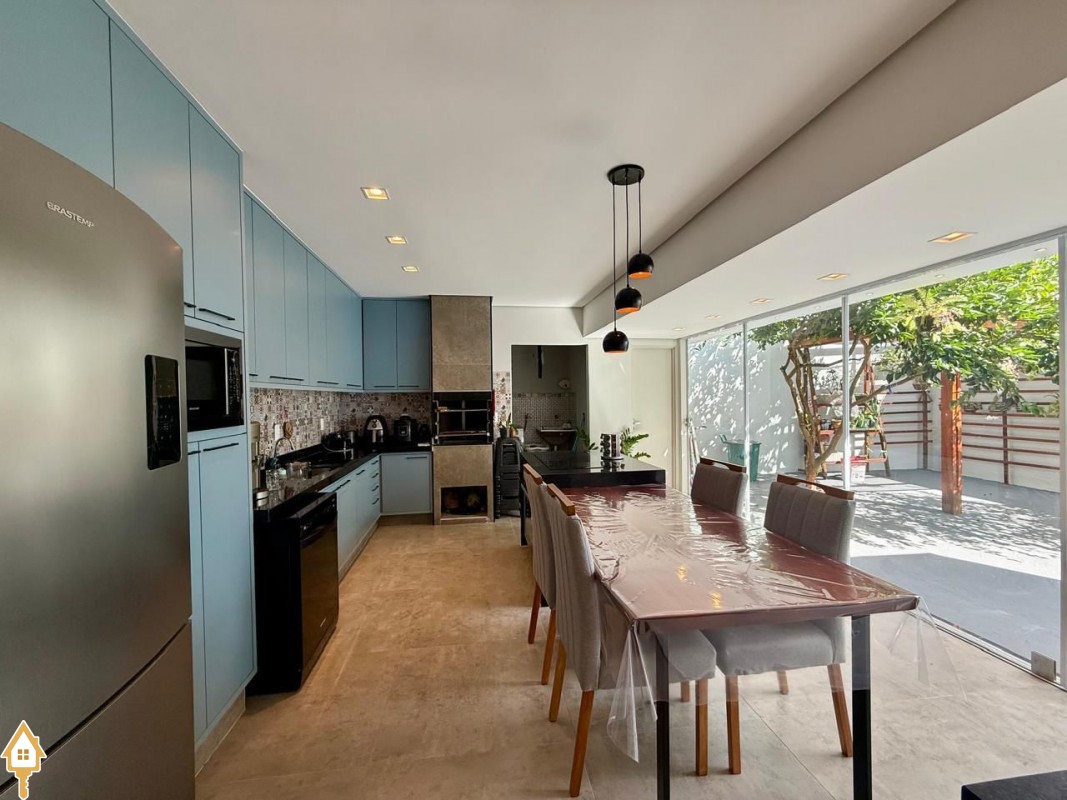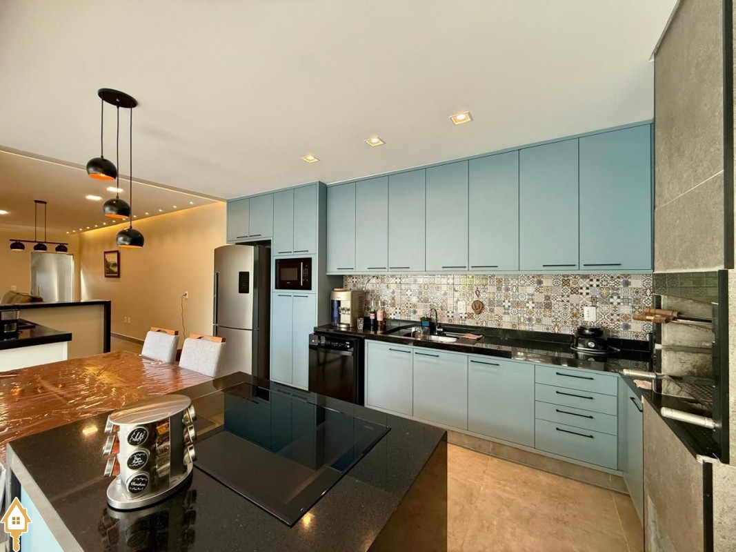 Casa à venda composta por três quartos, sendo um deles suíte, com ar-condicionado instalado em dois dos dormitórios. Conta com sala integrada à cozinha e à varanda gourmet com churrasqueira, todos os ambientes com marcenaria planejada e iluminação completa.