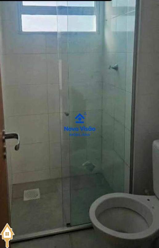 1 banheiro social com armário, espelho e box