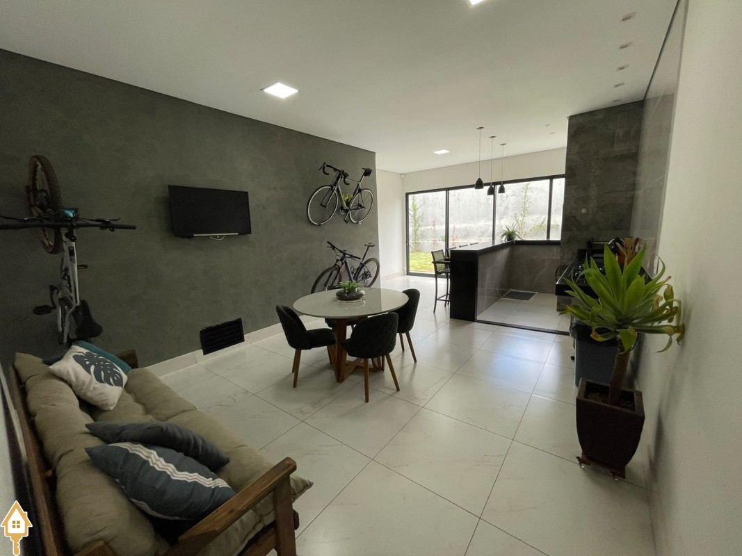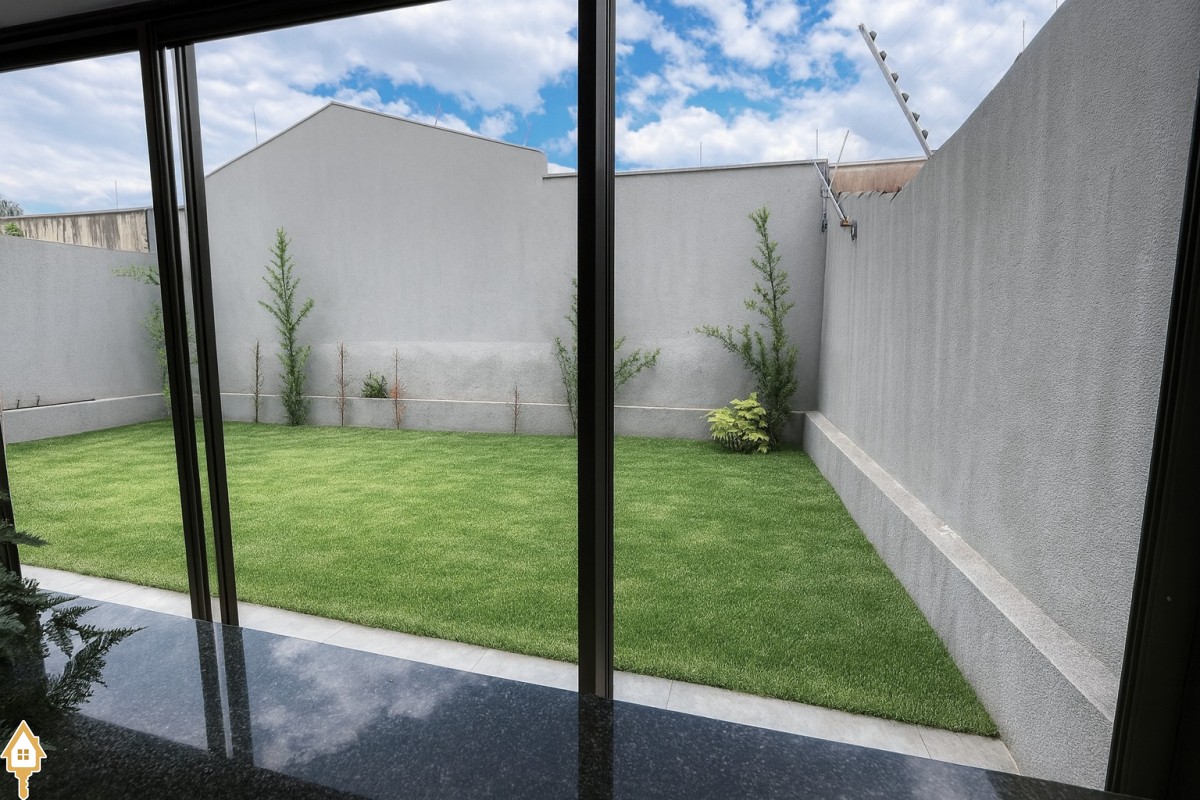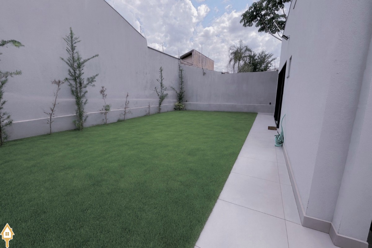 A área externa oferece espaço gourmet com churrasqueira integrado ao jardim, com quintal gramado que favorece momentos de convivência e lazer.