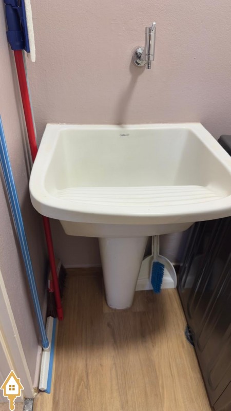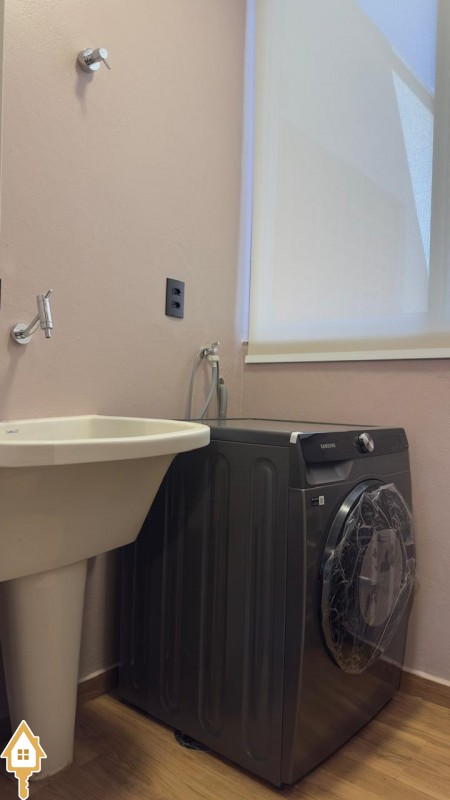 - área de serviço com máquina lava e seca e varal