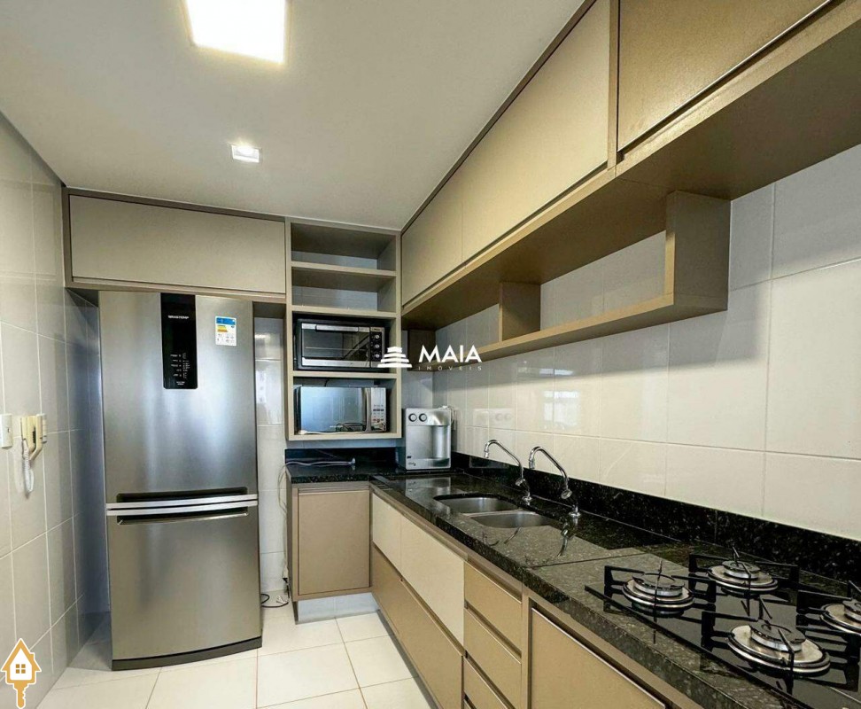 - Cozinha completa, equipada com forno, cooktop, geladeira, micro-ondas e filtro;