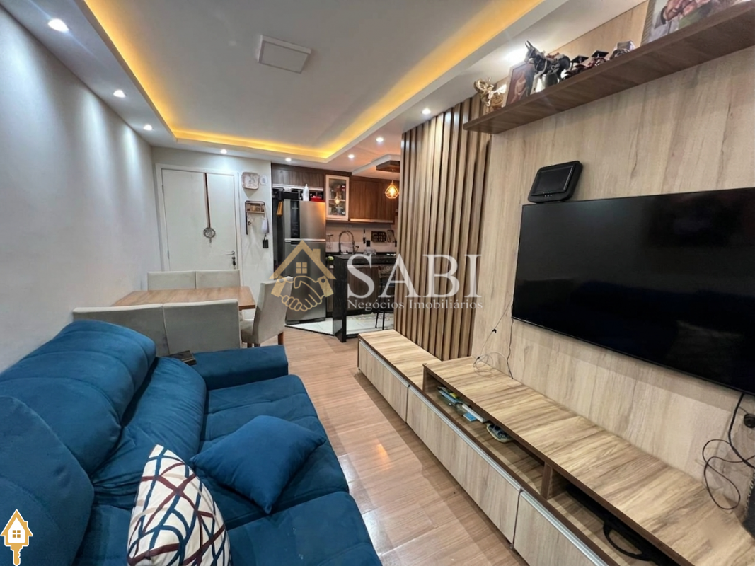 Apartamento PCD térreo, com 47 m², contendo sala, cozinha e quartos com móveis planejados, teto rebaixado na sala, 1 vaga de garagem na porta da torre.