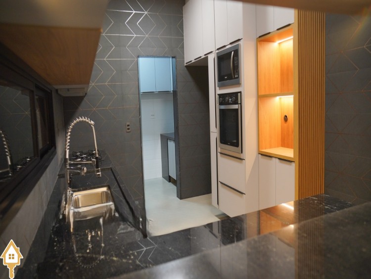 • Cozinha com balcão, fogão cook top, forno e micro-ondas instalados formando a torre quente;