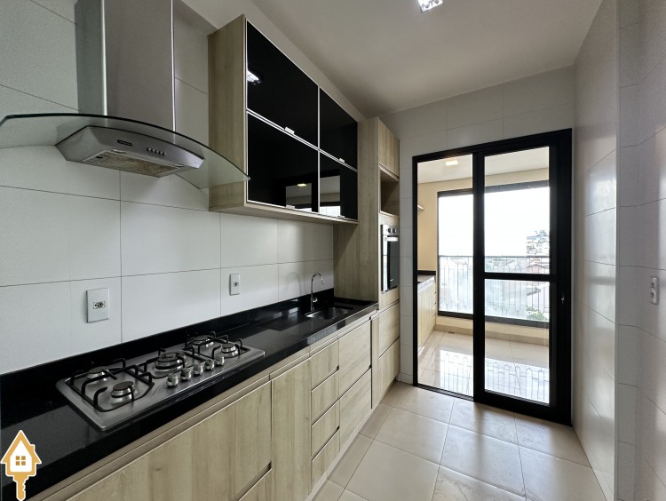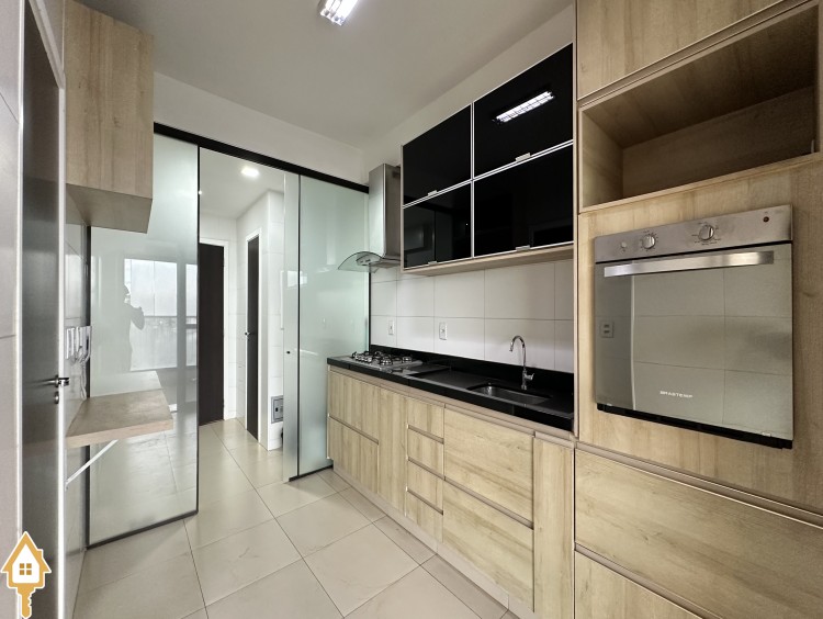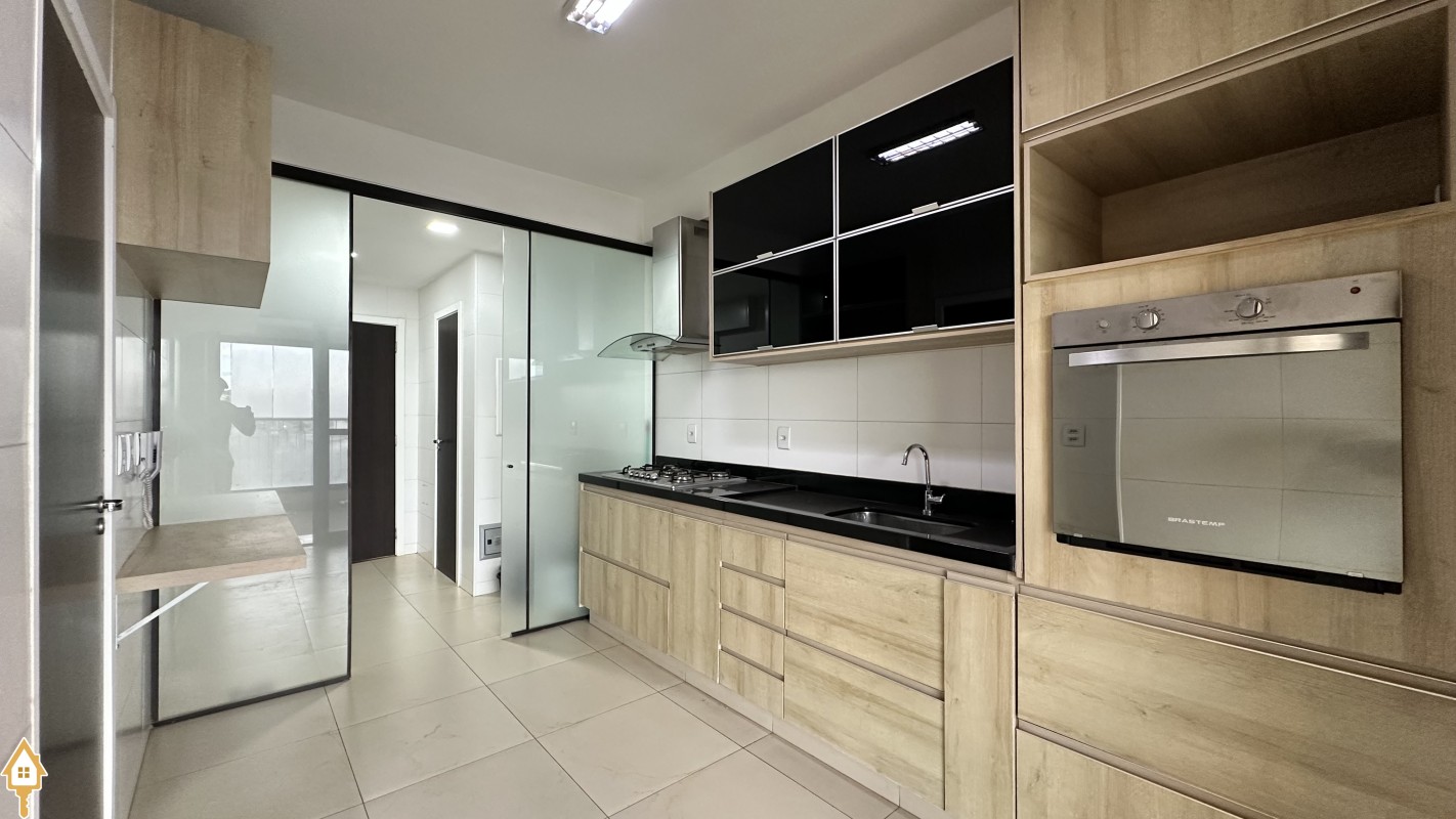 • Cozinha com armários planejados, cooktop e forno