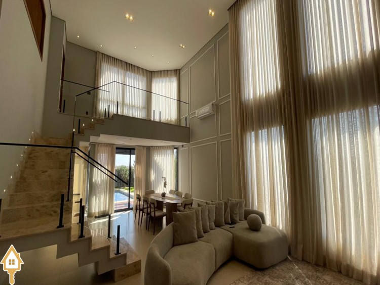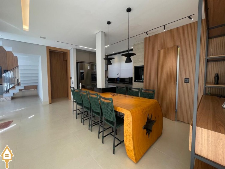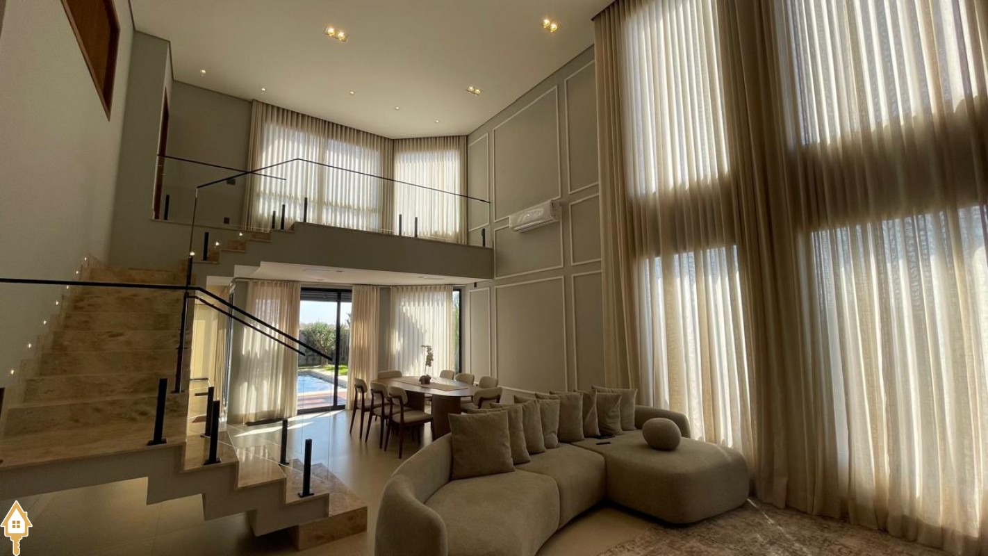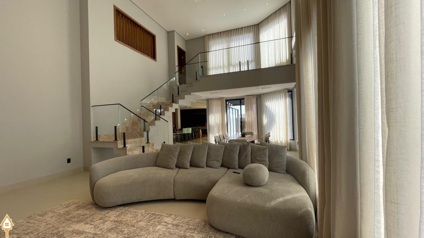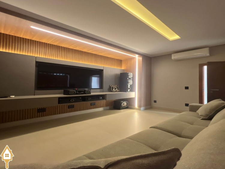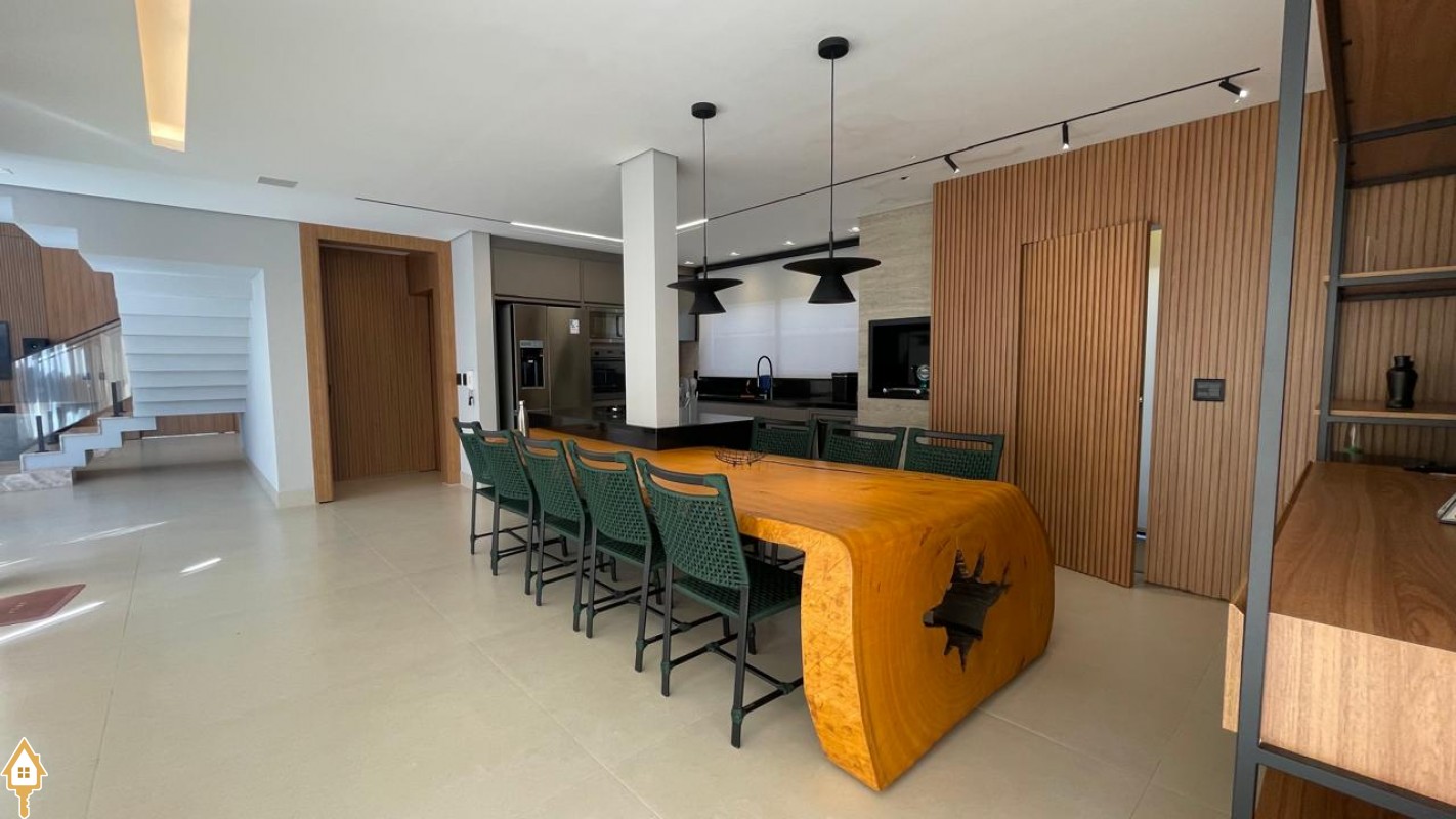 Casa de alto padrão com dois pavimentos, composta por 04 suítes, home cinema, mezanino e amplas salas de estar e jantar. Cozinha completa com espaço gourmet, além de lavabo, despensa e lavanderia.