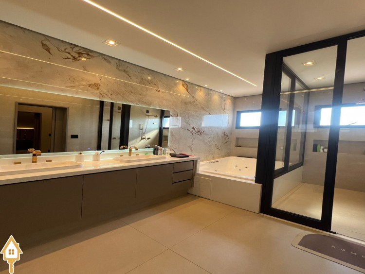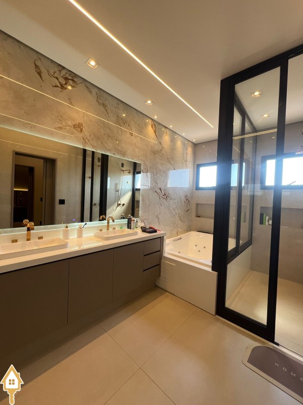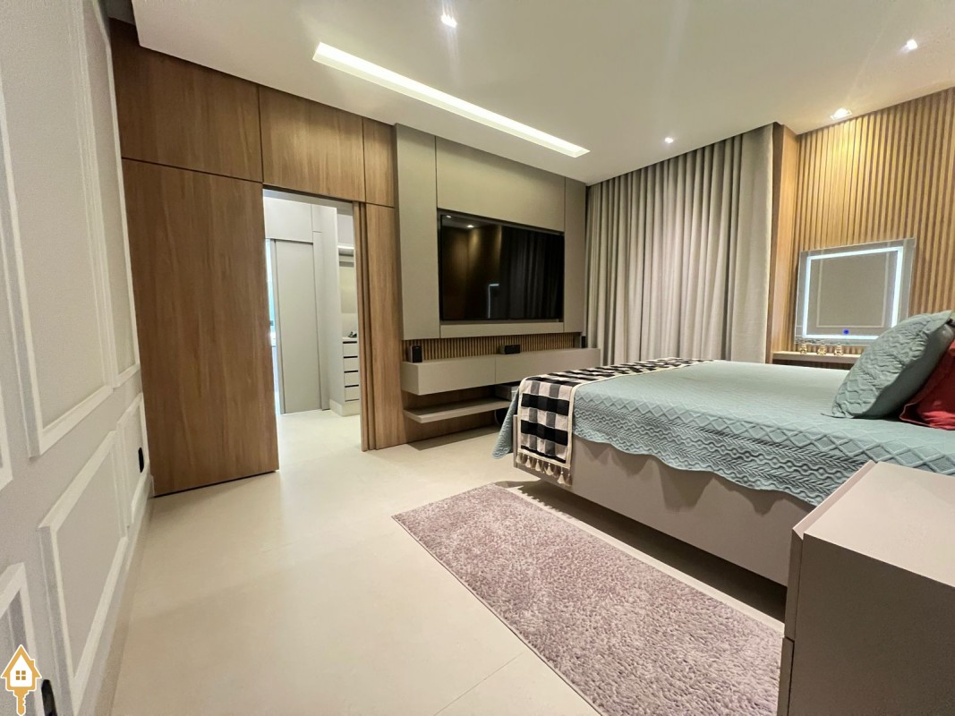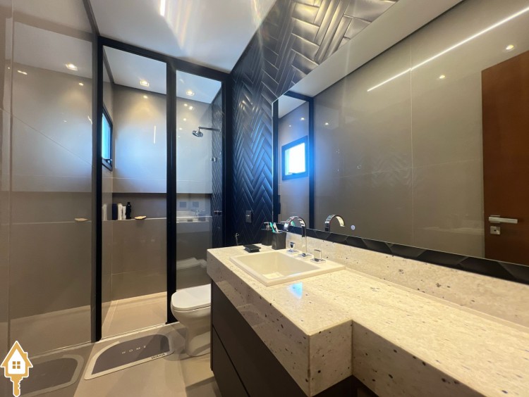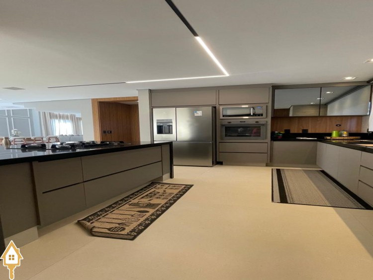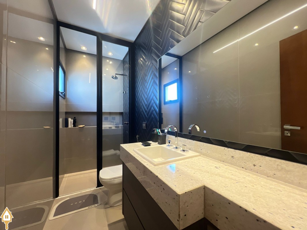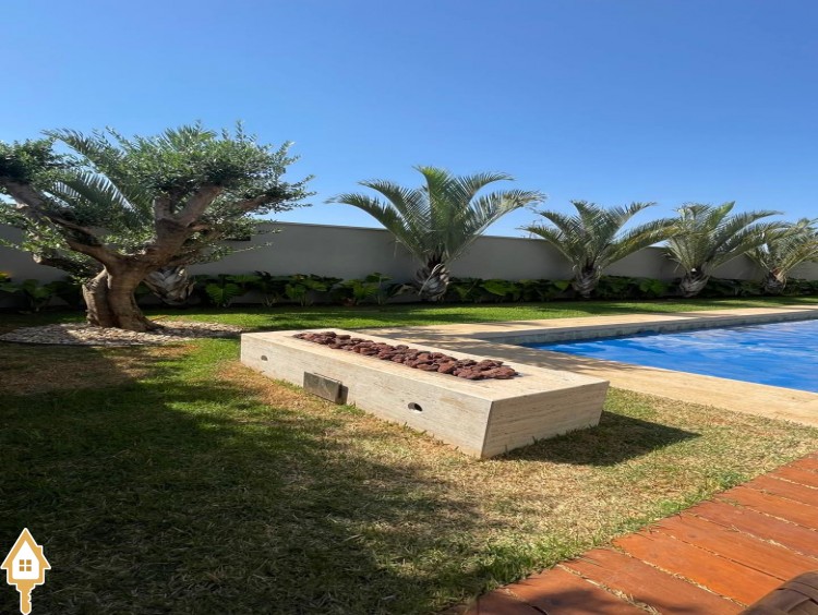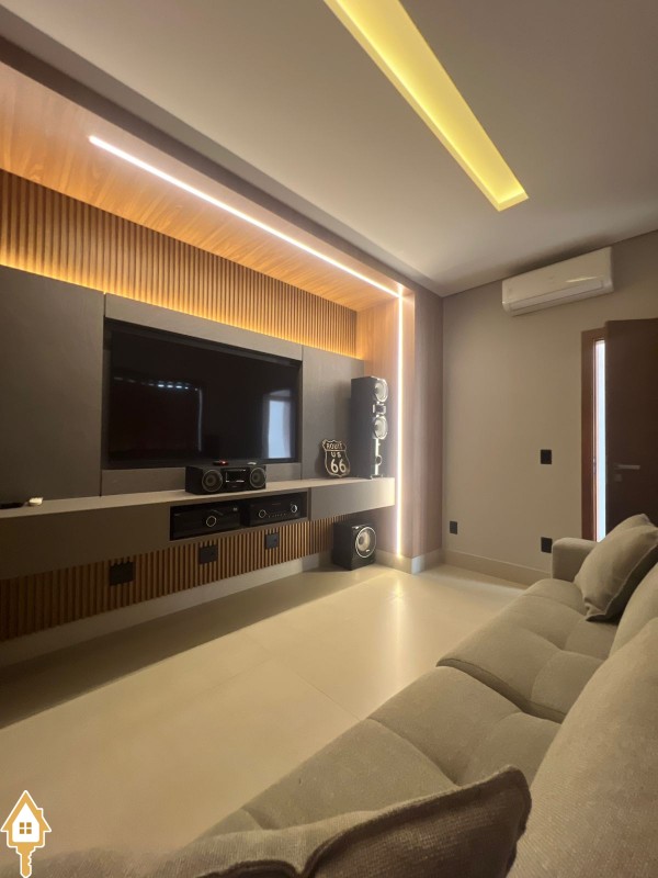 Casa de alto padrão com dois pavimentos, composta por 04 suítes, home cinema, mezanino e amplas salas de estar e jantar. Cozinha completa com espaço gourmet, além de lavabo, despensa e lavanderia.