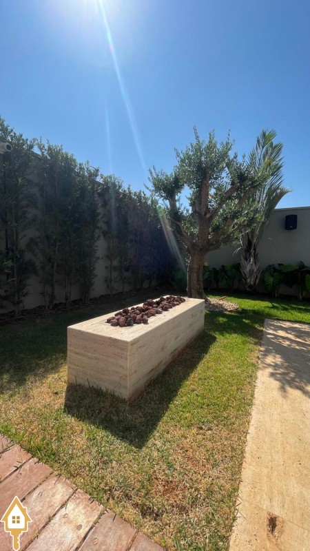 Área de lazer com piscina, lareira a gás e jardim com oliveira plantada e irrigação automatizada.