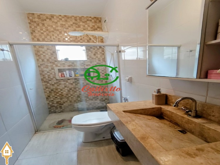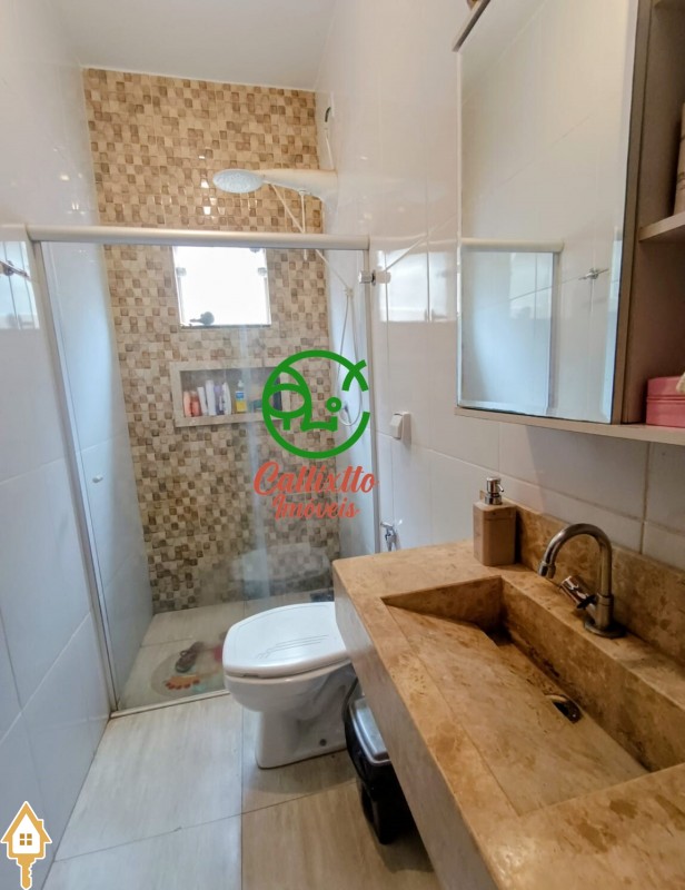 Banheiro social com box de vidro temperado, pia mármore bege bahia, armário e espelho