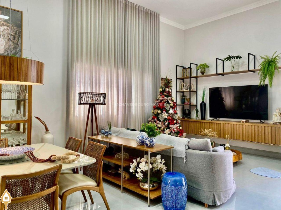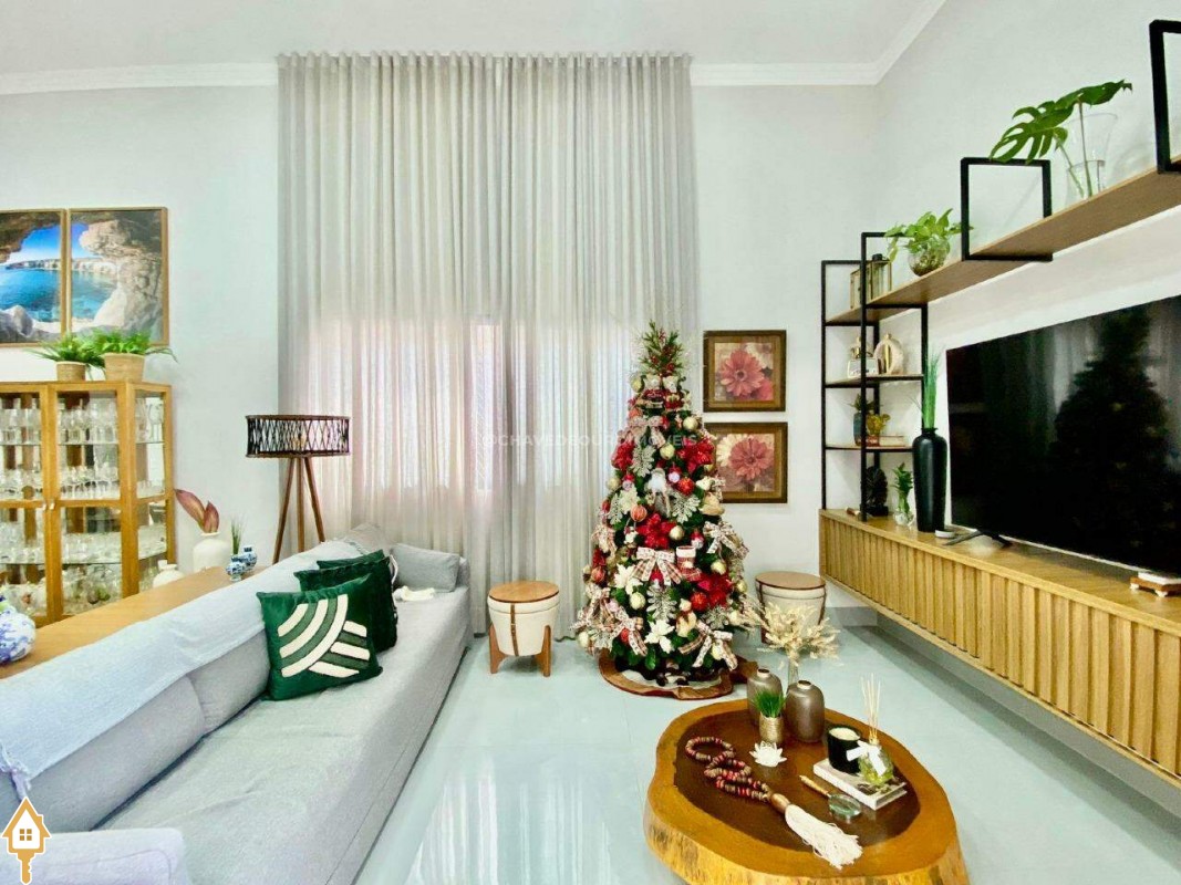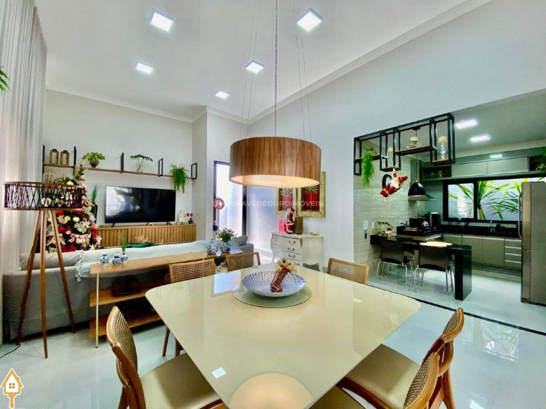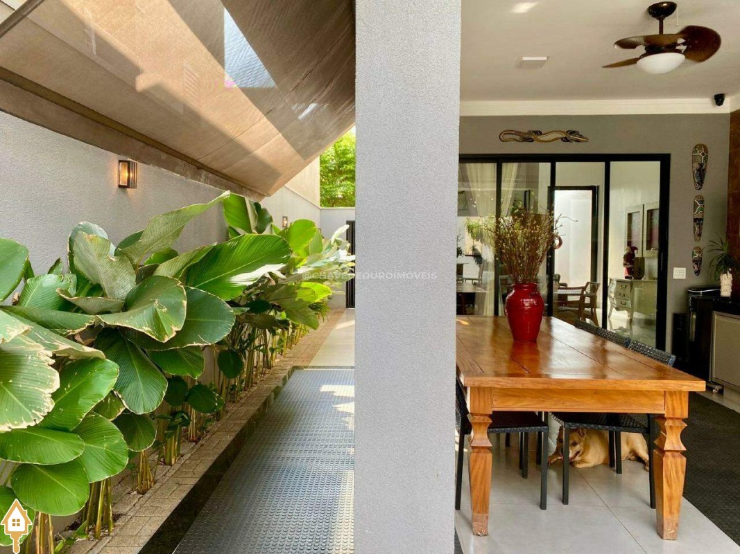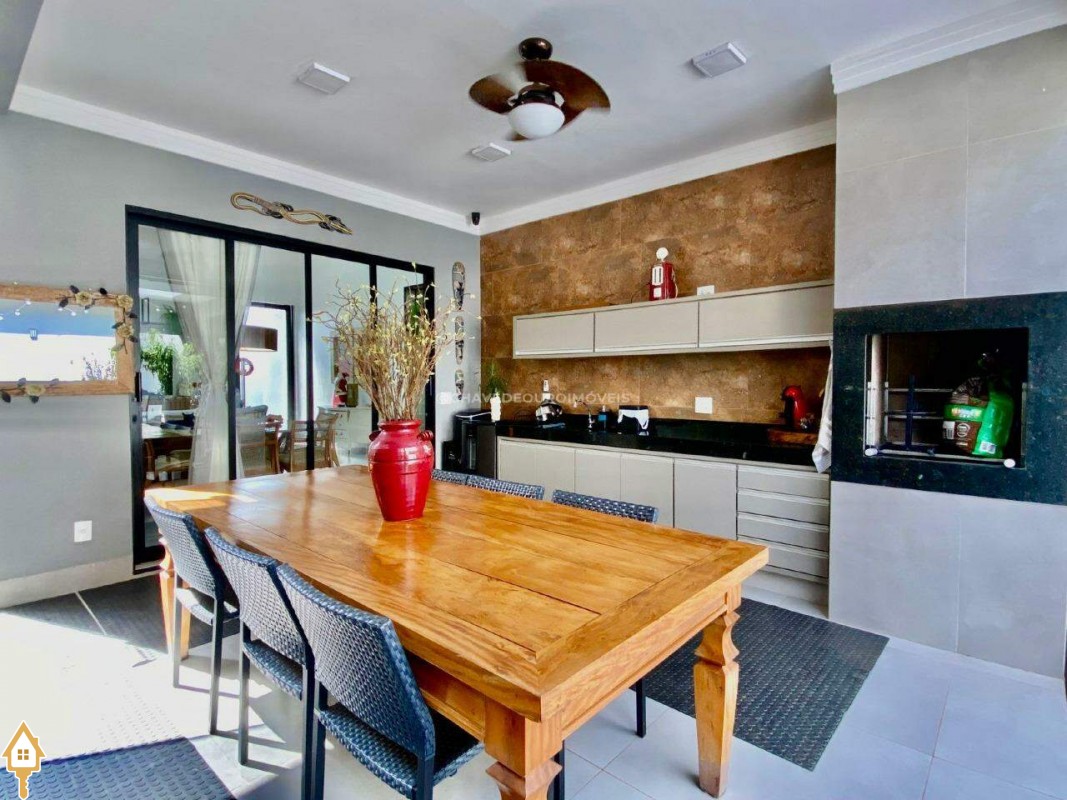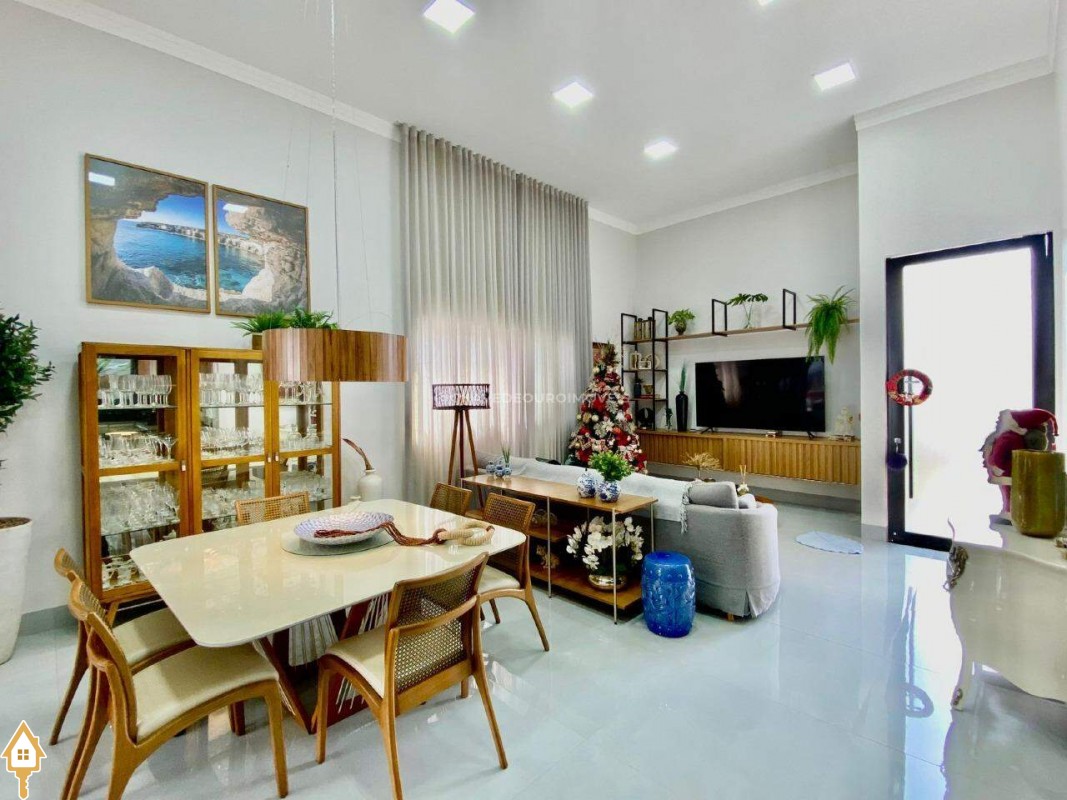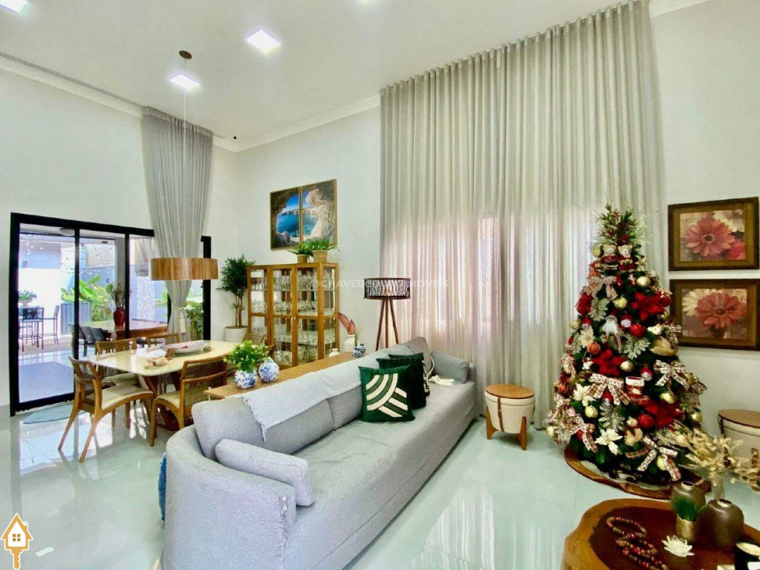Casa localizada no condomínio Estância dos Ipês em Uberaba, MG. Composta de três suítes com ar-condicionado, armários e box, sendo uma com closet. Dispõe de lavabo com armário, papel de parede e lustre, cozinha tipo americana equipada com armários, cooktop, forno e depurador de ar. Conta com sala de estar e jantar com pé direito duplo, integradas à cozinha e varanda gourmet equipada com armários, churrasqueira a carvão, toldo de proteção solar e área de quintal aberta, quatro vagas de garagem, sendo duas cobertas,